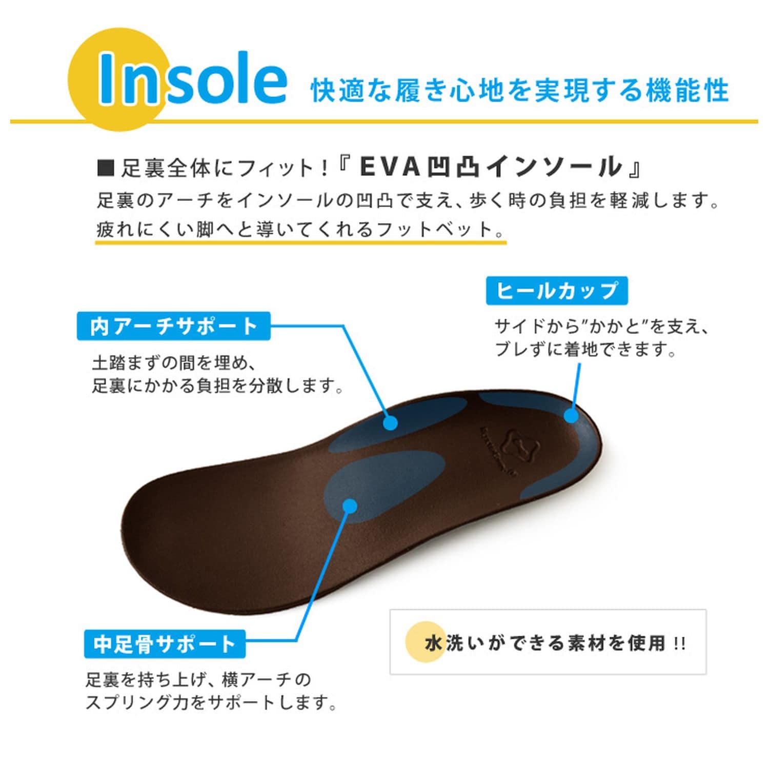 ・立体的なインソールは足裏のアーチにフィットするので、圧力を分散させ、疲れを軽減します。取り外しも可能なので、水で丸洗いでき、清潔に履いていただけます。