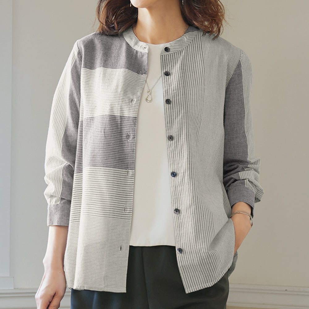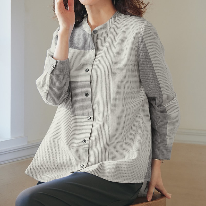 さまざまなストライプを巧みに組み合わせたバンドカラーのシャツ。軽やかな綿素材で羽織り物としても活躍。