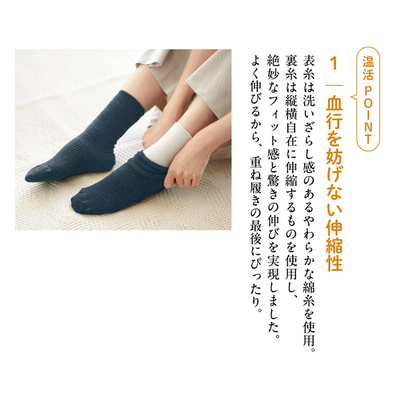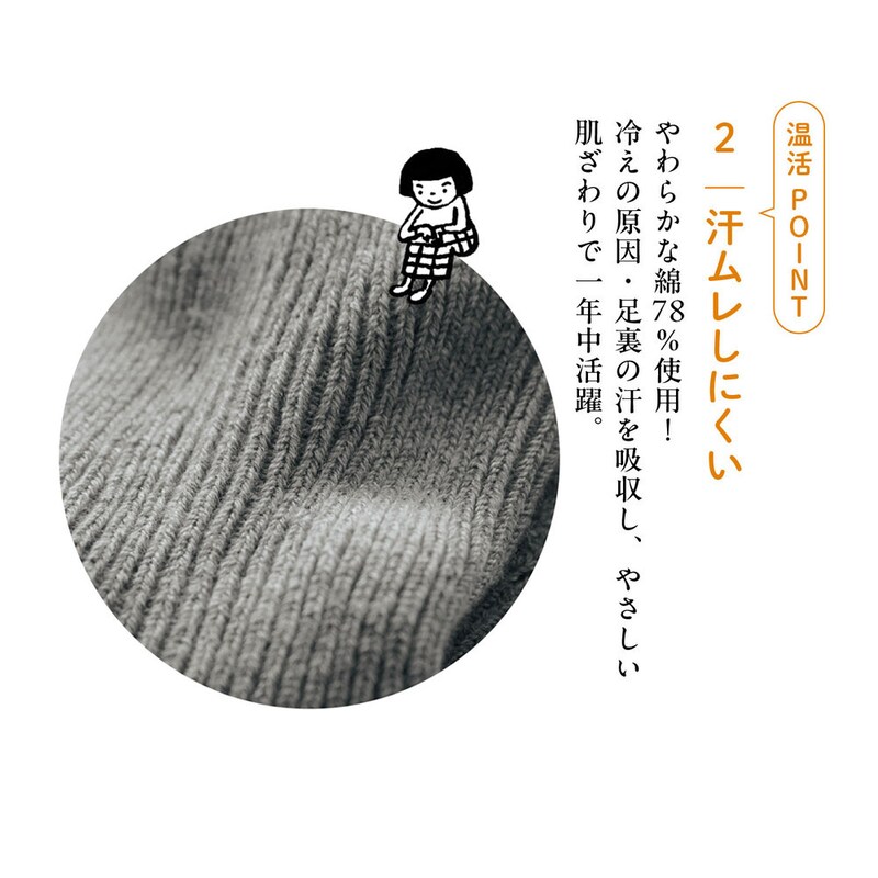 ほどよく厚みがあるので1足だけで履いてもしっかり温かく、足にやさしくフィットします。かかと付きでズレにくいのもポイント。