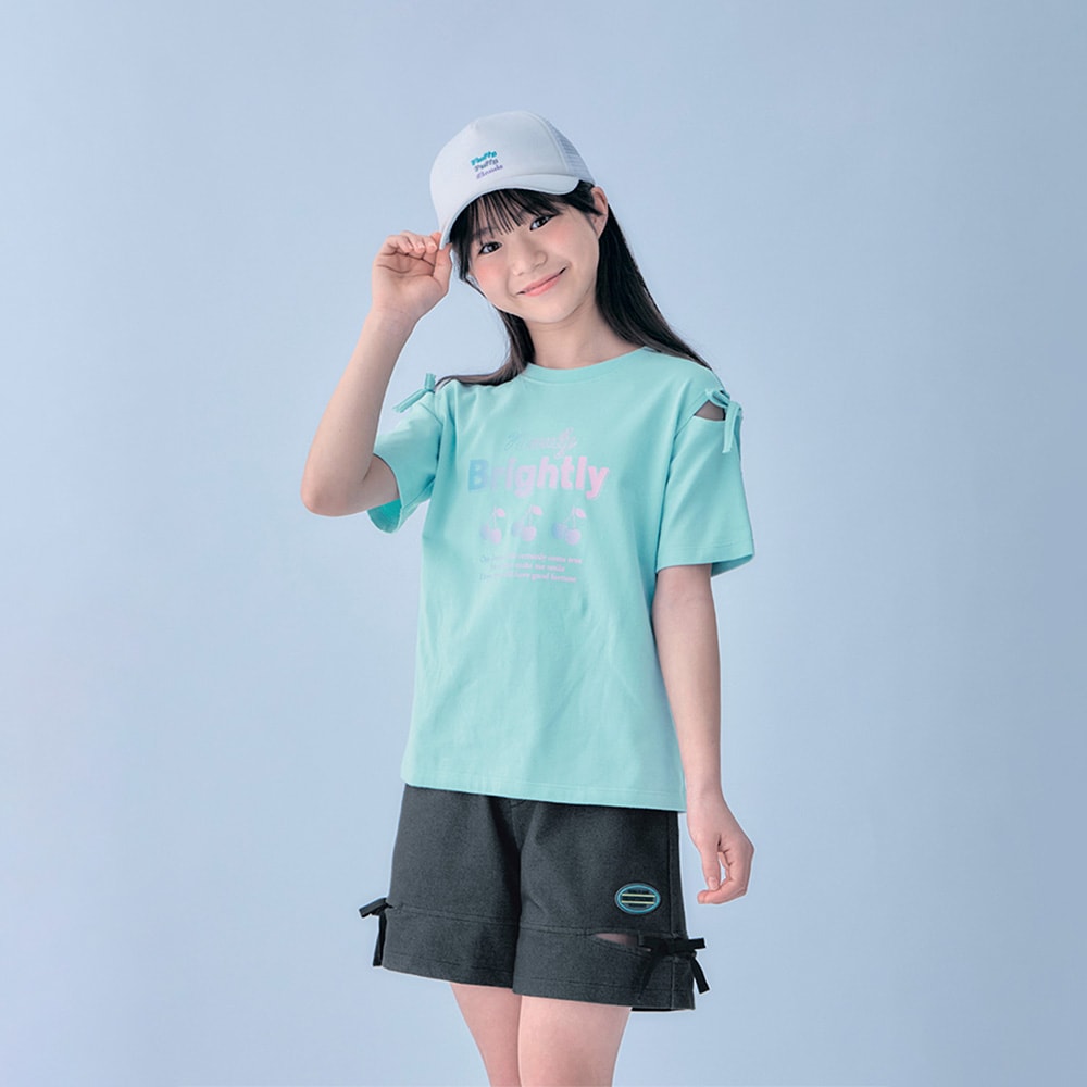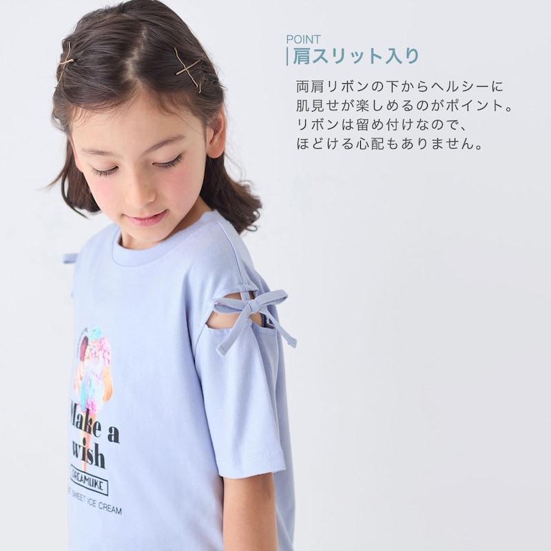 娘が肩のでるTシャツがほしいといい購入しました。リボンがあるため少し肩が見える程度で肌の露出が少なく学校にも着ていっています。子どもはお気に入りです。