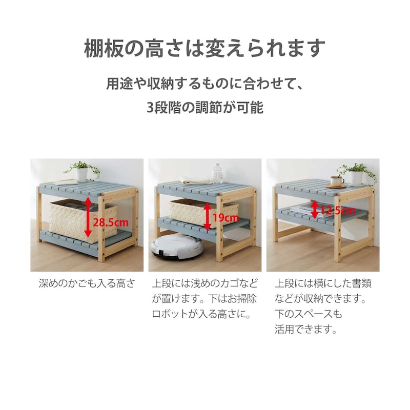 棚板の位置は、用途や収納するものに合わせて、3段階に調節できます