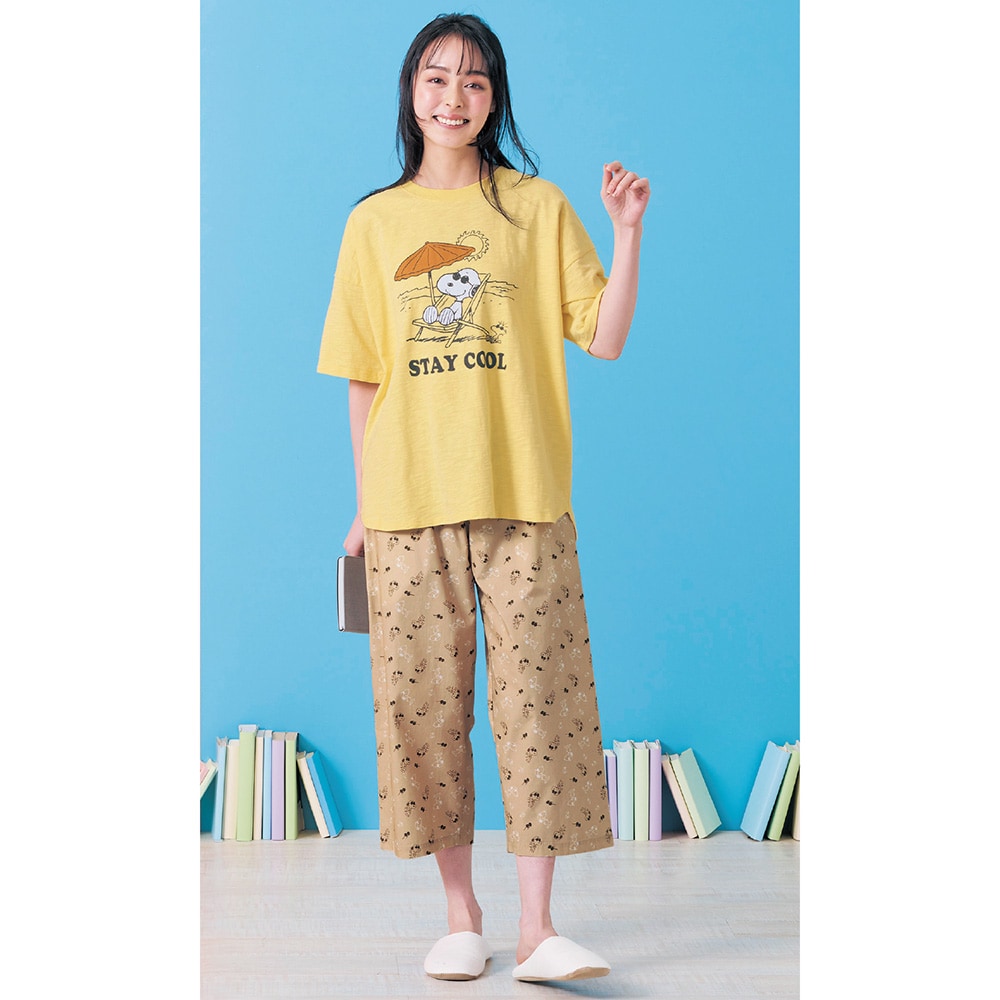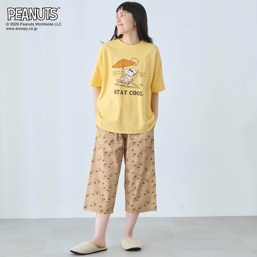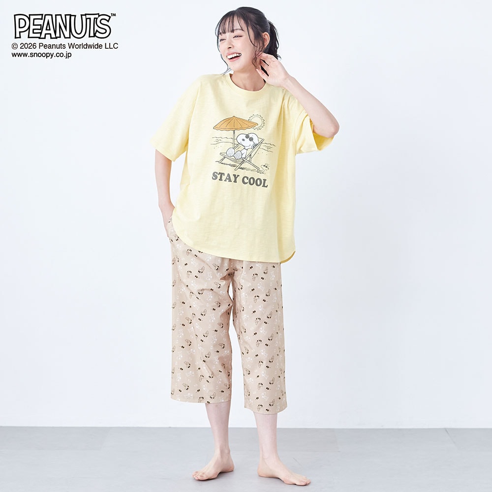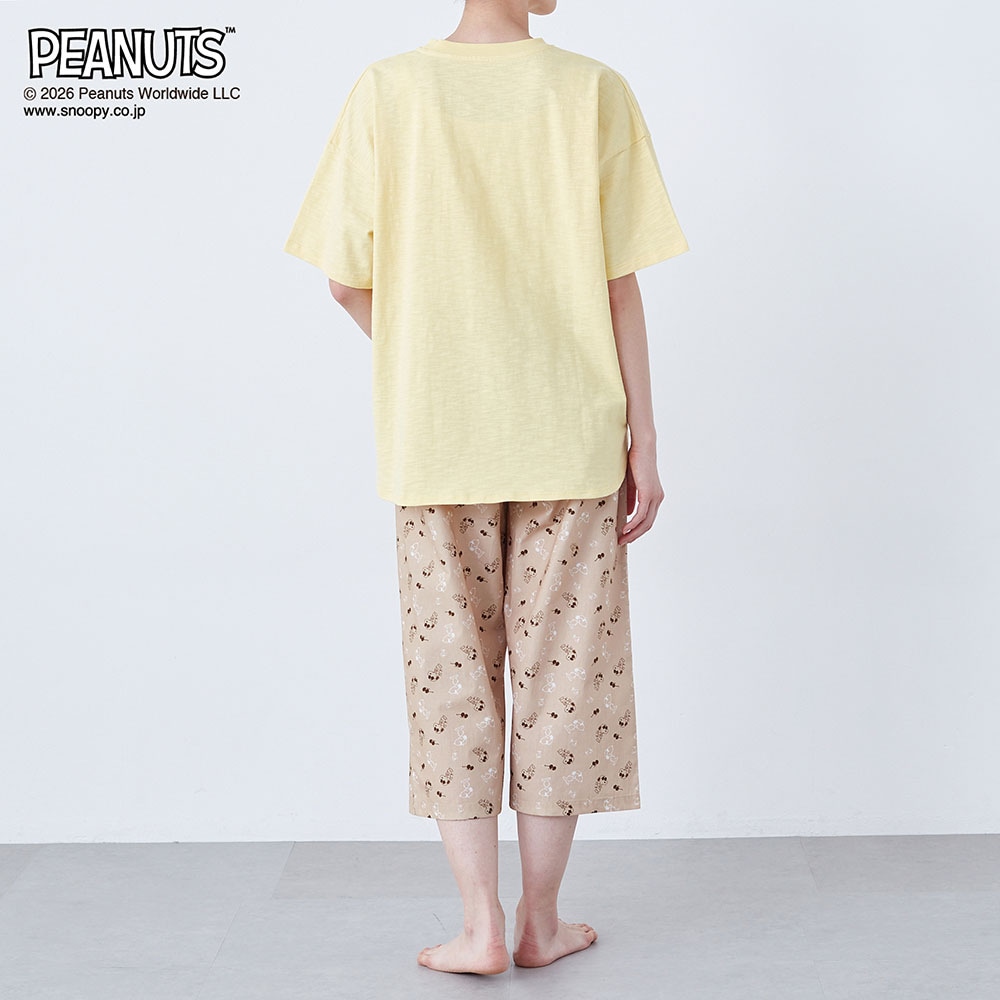 【新柄登場】動きやすくて気持ちいい。デザインが可愛い、 天竺トップスと布帛パンツのパジャマ 「スヌーピー」