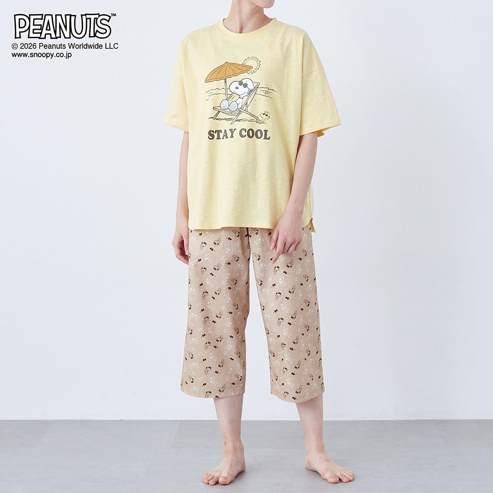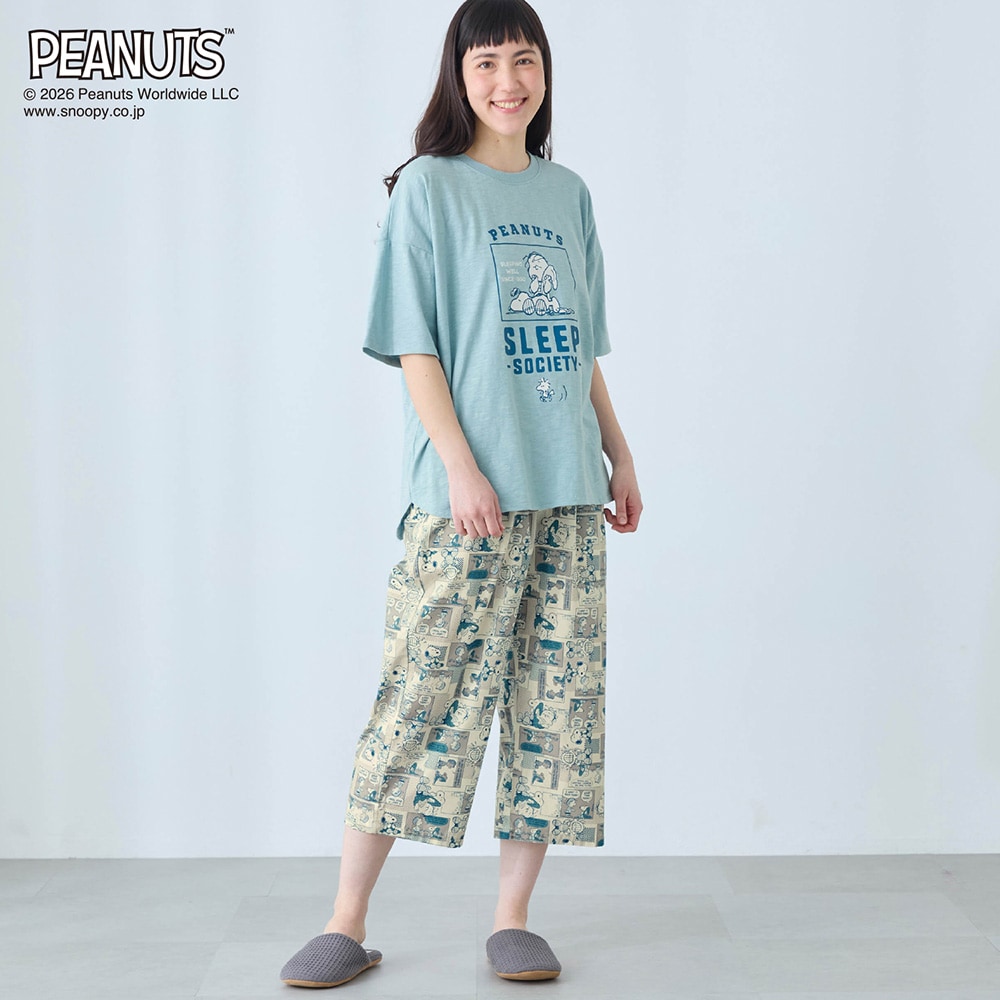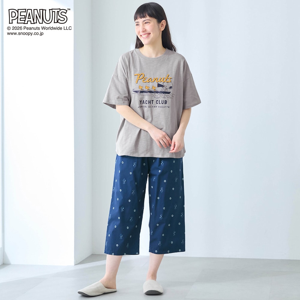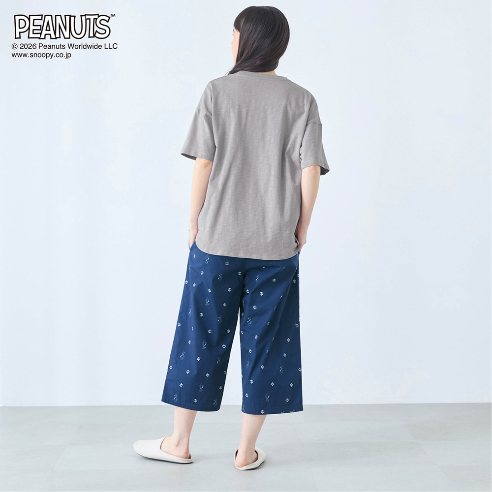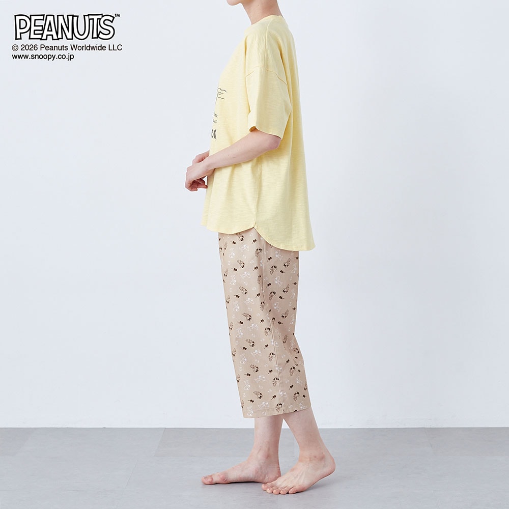 【新柄登場】動きやすくて気持ちいい。デザインが可愛い、 天竺トップスと布帛パンツのパジャマ 「スヌーピー」