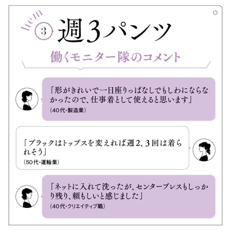 仕事用に黒を購入。 名前のとおり、生地は薄手でさらさら、洗濯してもアイロンいらず。ガードルはいつも履いているので下着のラインも気になりません。 ヘビロテです。 ウエストゴムだけどベルト通しもあり調整できるので、ずり落ちる心配がないのも高ポイント。 思ったより幅がありワイドパンツに近いので、もう少し細身のストレートでもいいかなと思いました。