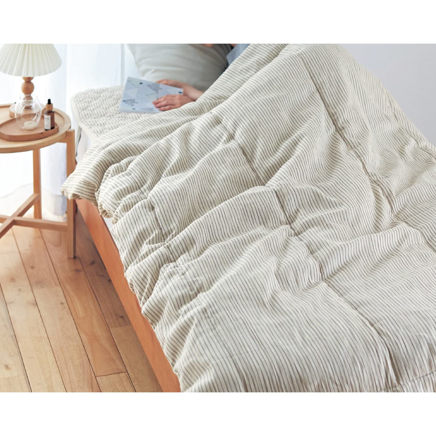 カタログで楊柳のシーツとこちらを見つけてまずシーツを購入、楊柳のざらっとした感じが気に入ってキルトケットも欲しくなりました。ただレビューが全然なくてずっと迷っていたところセールで少しお安くなったため購入してみました。サラッとして軽くてそれなのにエアコンをつけてもこれ一枚で大丈夫なのがうれしいです。ブルーを購入しましたが、色はグレーに近い青です。