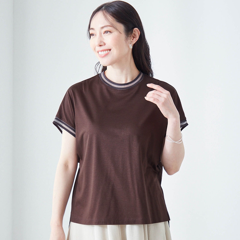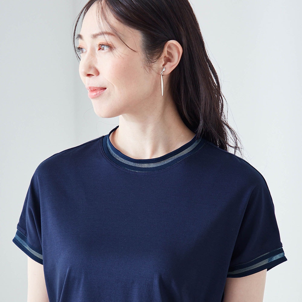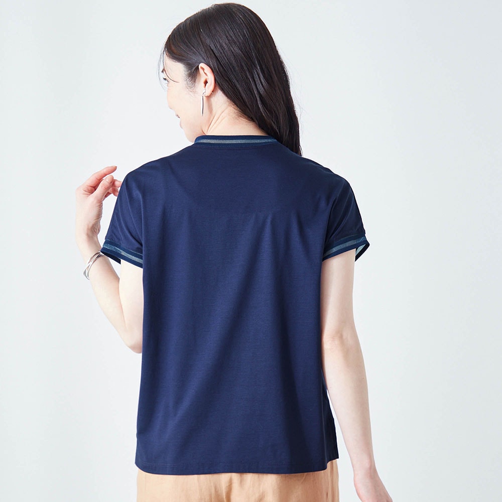 テンセル素材のためシルクのようななめらかな肌触りと光沢感があります。やや高めのネックといっても、窮屈感は無くちょうどいい。フレンチ袖のような形でも脇パネルでバッチリ脇は隠れ安心。襟ぐりと袖口のシアーでお洒落なTシャツ。