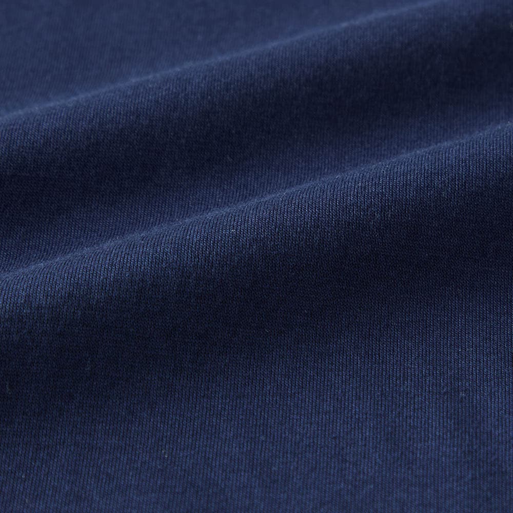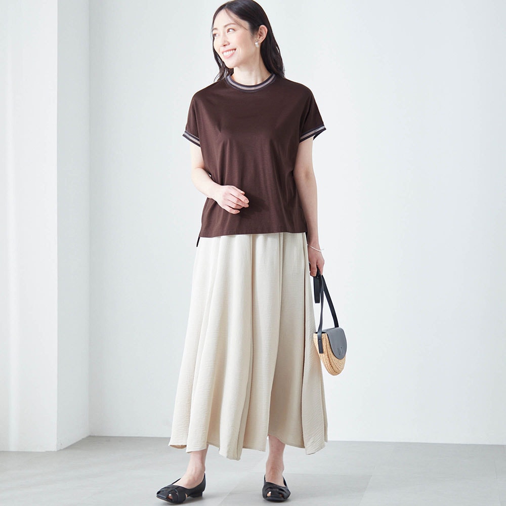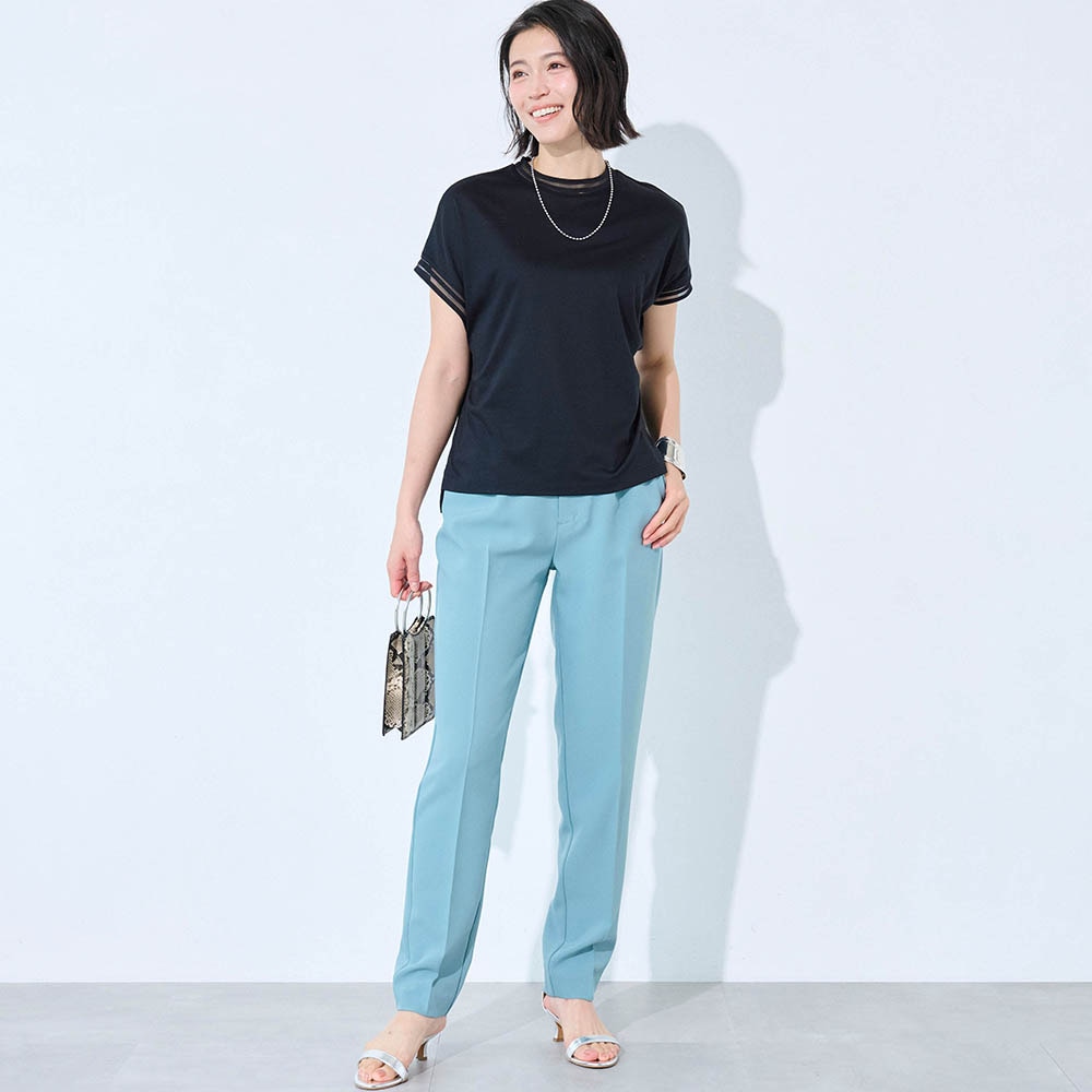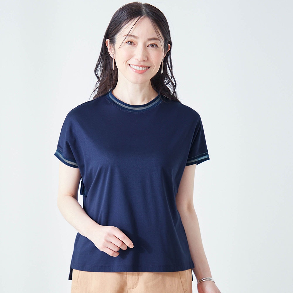 テンセル素材のためシルクのようななめらかな肌触りと光沢感があります。やや高めのネックといっても、窮屈感は無くちょうどいい。フレンチ袖のような形でも脇パネルでバッチリ脇は隠れ安心。襟ぐりと袖口のシアーでお洒落なTシャツ。