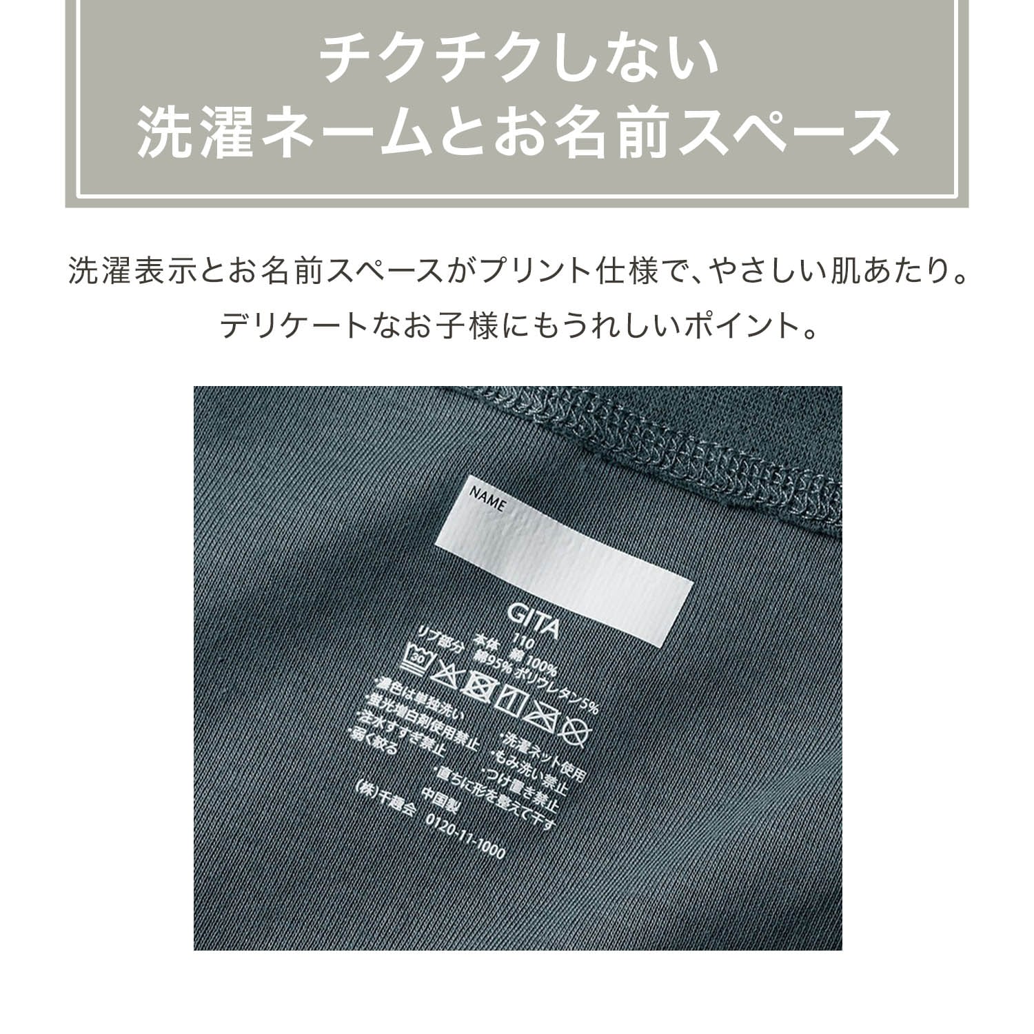 ・脇に縫い目がなく、洗濯表示をプリントにすることで肌あたりにも配慮