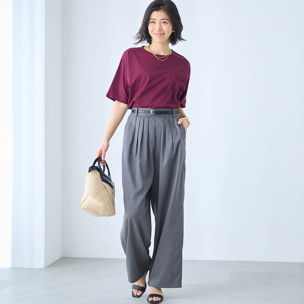 デザインがシンプルなので、基本的になんにでも合わせやすいと思いますがちょっと間違えると部屋着感が出るので、色合わせなどは考えて着ています。
