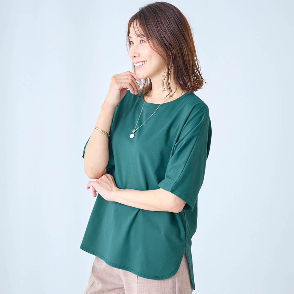 シンプルなデザインだが、二の腕が隠れる袖の長さもちょうど良く全体的に細見えすると喜んでいました。