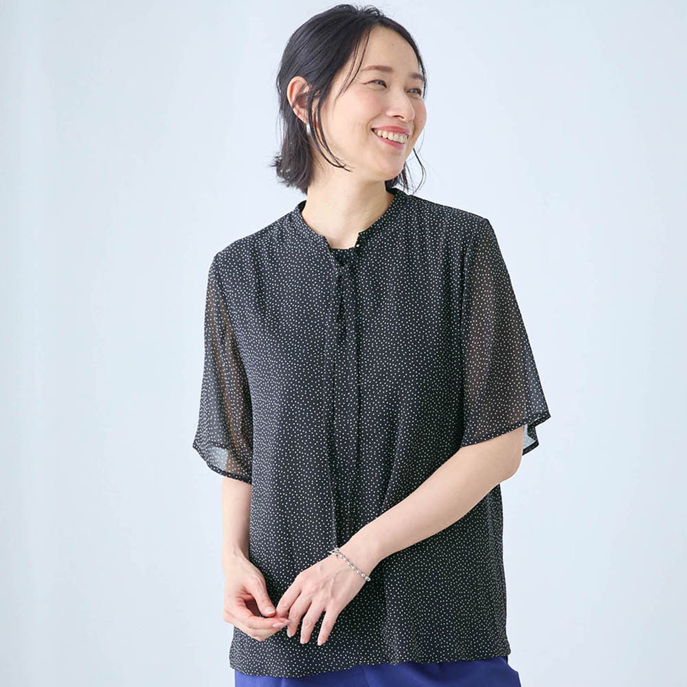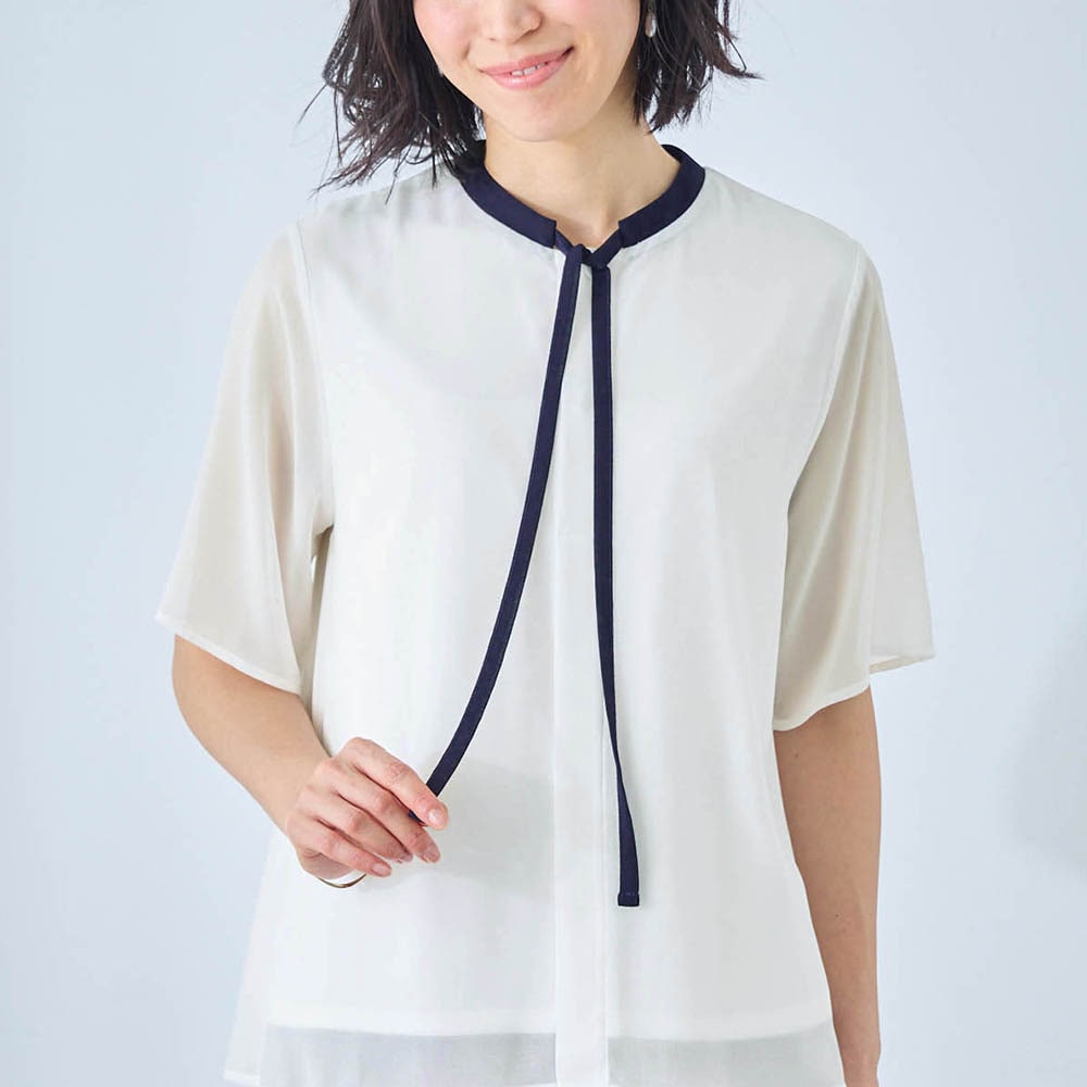 画像など見ていて、前面が上から下まで隠しボタンのようになっているのかな?とよく分からなかったのですが、届いてみたらかぶるタイプのブラウスでした。 1番上はブラウスと同じ生地のボタン、その下にはスナップボタンが隠れています。 スナップボタンまで外すと、首周りが大きめに開くので、着脱はしやすいと思います。 サラリとした生地でシワもできなそうです。 袖以外は裏地が付いているし、二の腕も隠せるので、安心できます。 オフィス向きな雰囲気がありますが、普段のお出かけにも使いたいです。