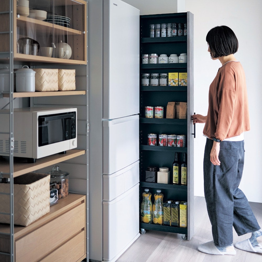 パントリーのない我が家にとってとても重宝する収納ケースになりました!こちらを設置したことにより、毎日使うコーヒーやお茶、パンを取りやすい動線に置くことによりストレスのない支度ができるようになりました。そしてそれらを棚の上に置きっぱなしにする事なく、また収納棚の奥の方を探す事なく見つける事ができるようになりました!もう一点購入しようか検討中です。