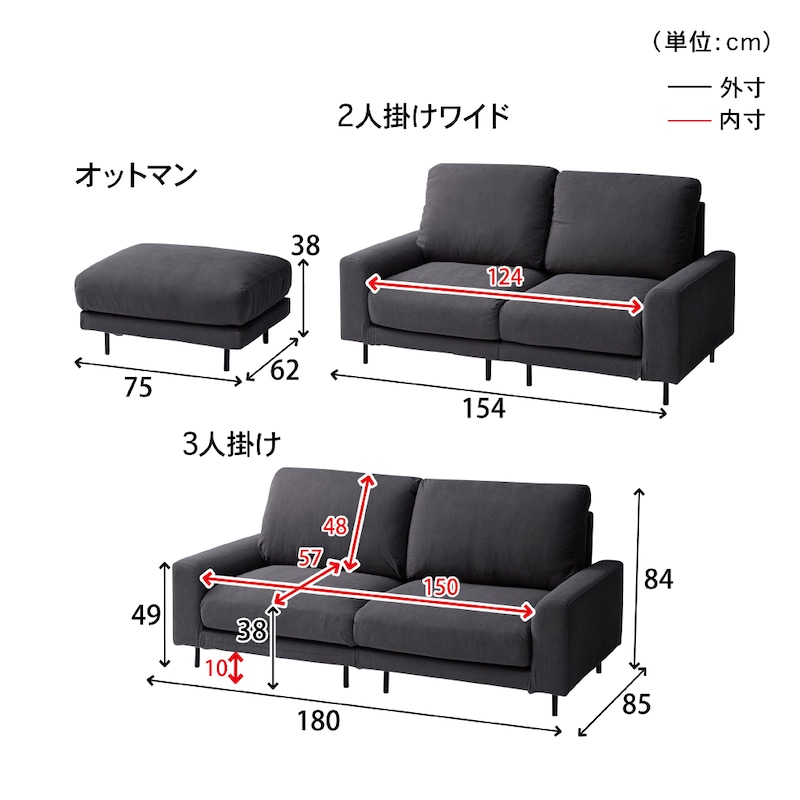 ■3人掛け/幅180、奥行85、高さ84(座面高38)cm