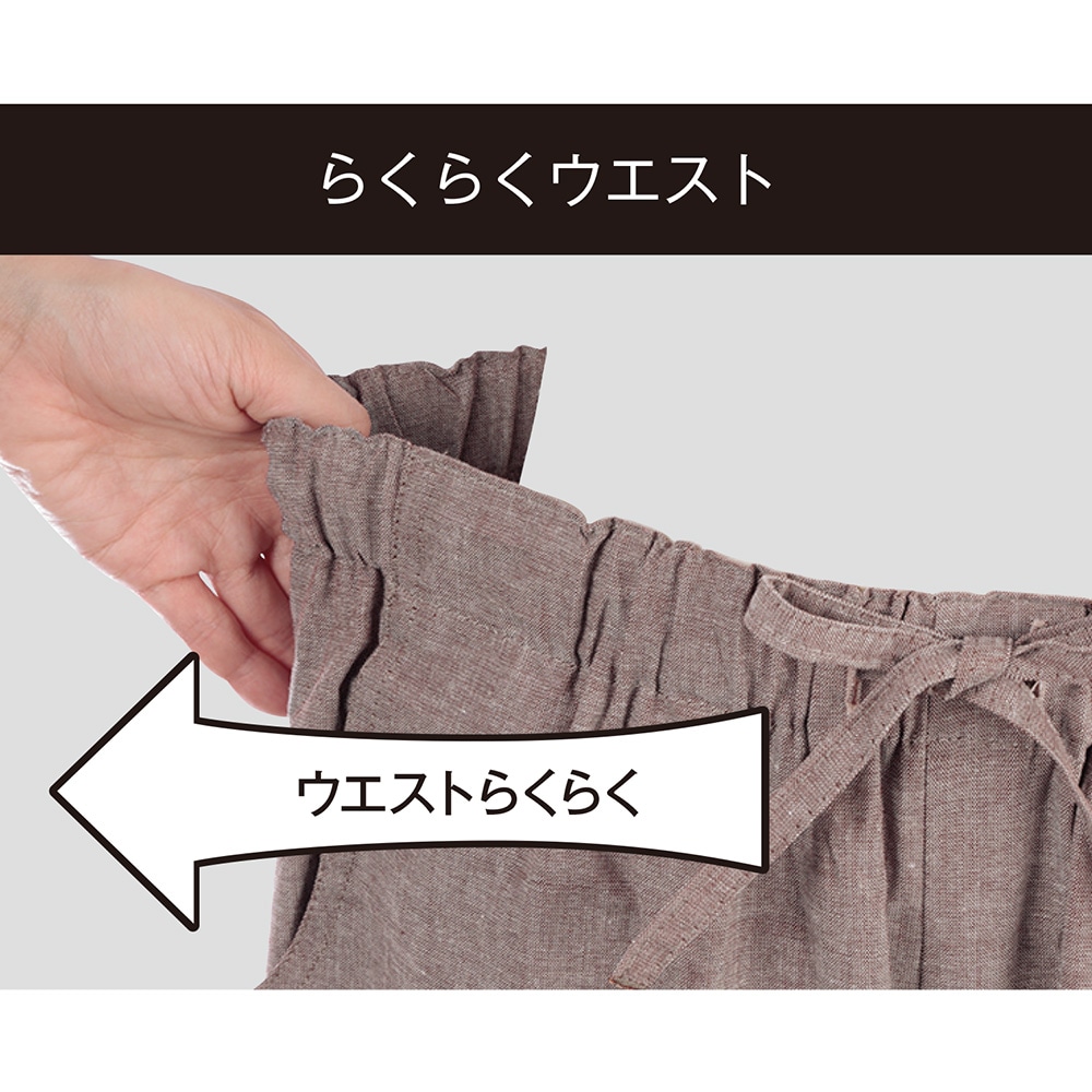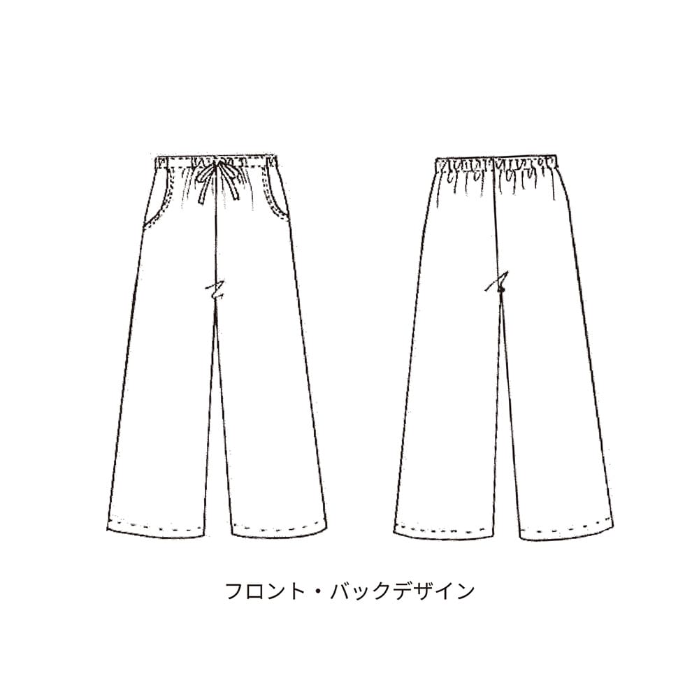 ●ウエスト総ゴム入、前:左右ポケット、ウエスト部分共布リボン、裏地なし