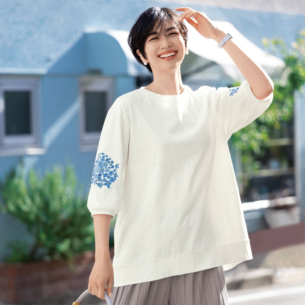 紫陽花の刺繡がグラデーションになっていてキレイです。サラッとした肌触りでまとわりつかないので着やすいです。ホワイトも透ける感じがあまりなく気にせず一枚でも着られます。自宅用の普段着の予定でしたが、ちょっとした外出着としても大丈夫でした。