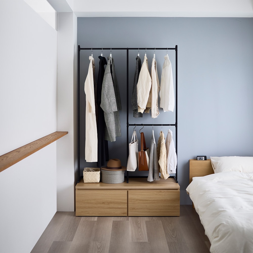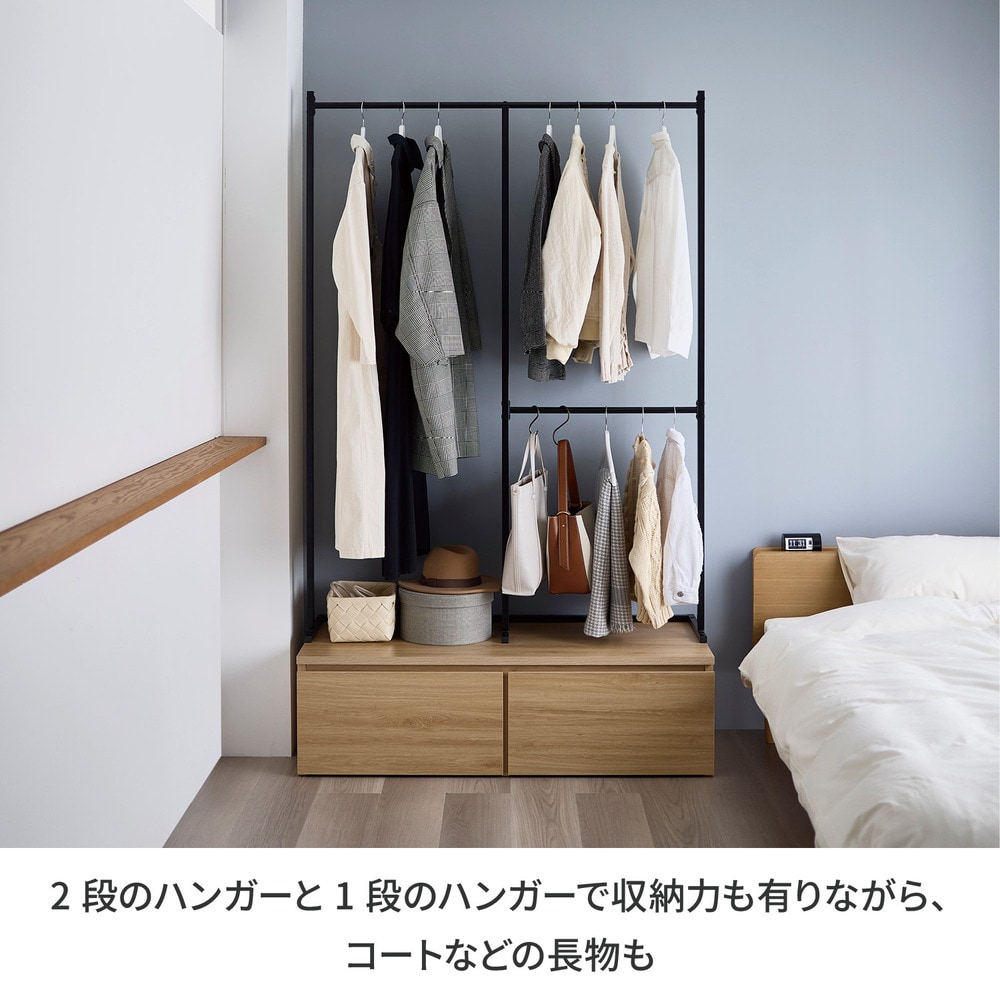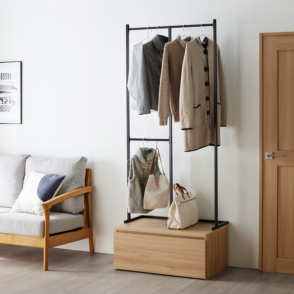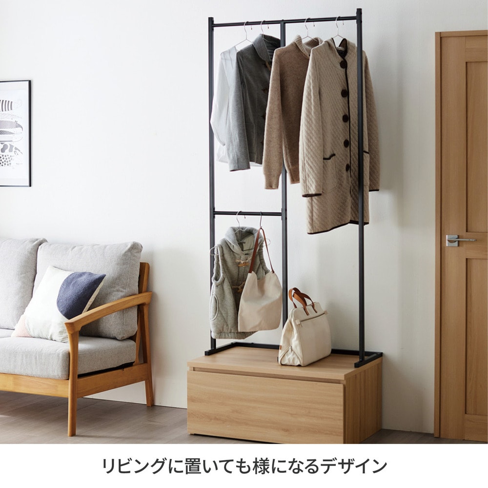組み立ててみると思ったより大きかったですが、3箇所にハンガーをかけれる機能が良いです。低いところは子供でもかけることができますから。ただ値段が少し高めなのと、下の収納の木の色味が写真より薄めだったこと、一部ポールの塗装が剥げてサビがあったことが残念でした。もう今回はそのまま交換せず組み立てましたが、検品はしっかりして頂けると嬉しいです。