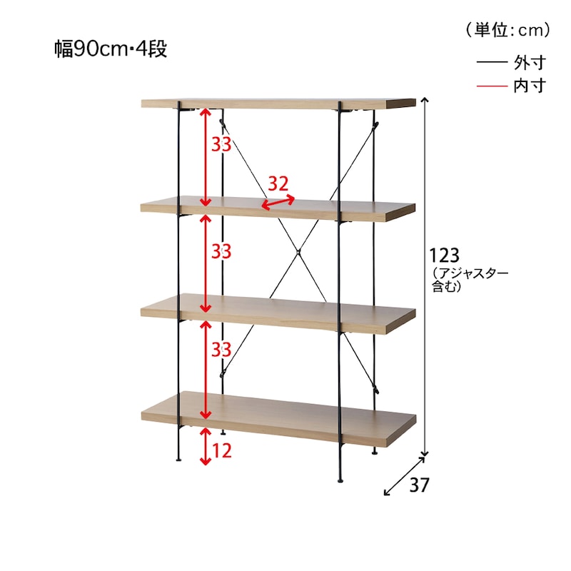 ■幅90cm・4段/奥行37(アジャスター含む)、高さ123(アジャスター含む)cm