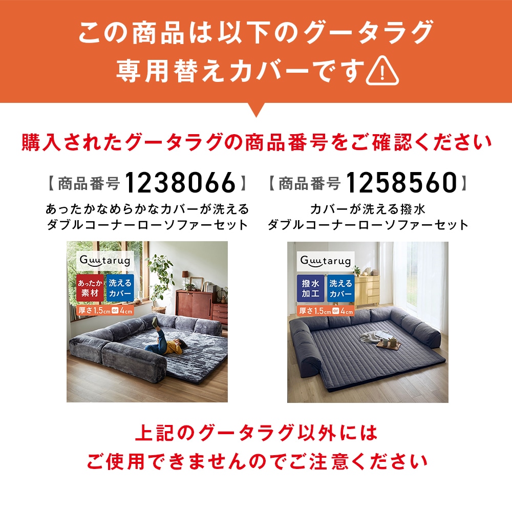 商品のご購入、ならびにレビューへのご投稿ありがとうございます。 レビュー内容より「商品番号:1222791_ラグが洗えるダブルコーナーローソファーセット」に取り付けてのご使用をご検討されていたと推察しました。 商品ページ上の画像や仕様欄の注意書きにも記載のある通り、本製品は「商品番号:1238066_あったかなめらかなカバーが洗えるダブルコーナーローソファーセット」「商品番号:1258560_カバーが洗える撥水ダブルコーナーローソファーセット」以外の商品にはご使用いただけません。 分かり辛かったようで申し訳ございませんでした。 今後もお客様により満足度の高い商品説明、及び商品をお届けできるよう努力をしてまいります。貴重なご意見ありがとうございました。