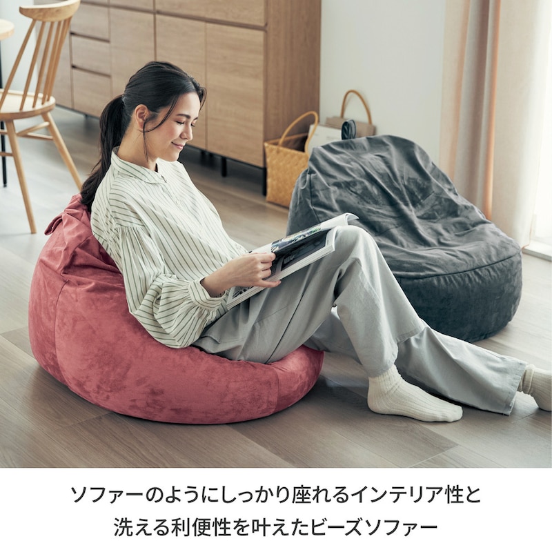 グレーを購入。現在使っているビーズクッションより少し小さめなので購入しました。座り心地は良いのですが、クッションカバーの生地が最悪です。お菓子の粉などが付くと払っても取れません。コロコロやガムテープでペタペタしても取れません。買ったばかりですがクッションカバーは捨てて、サイズがきちんと合ってませんが他のクッションカバーを付けています。残念です。