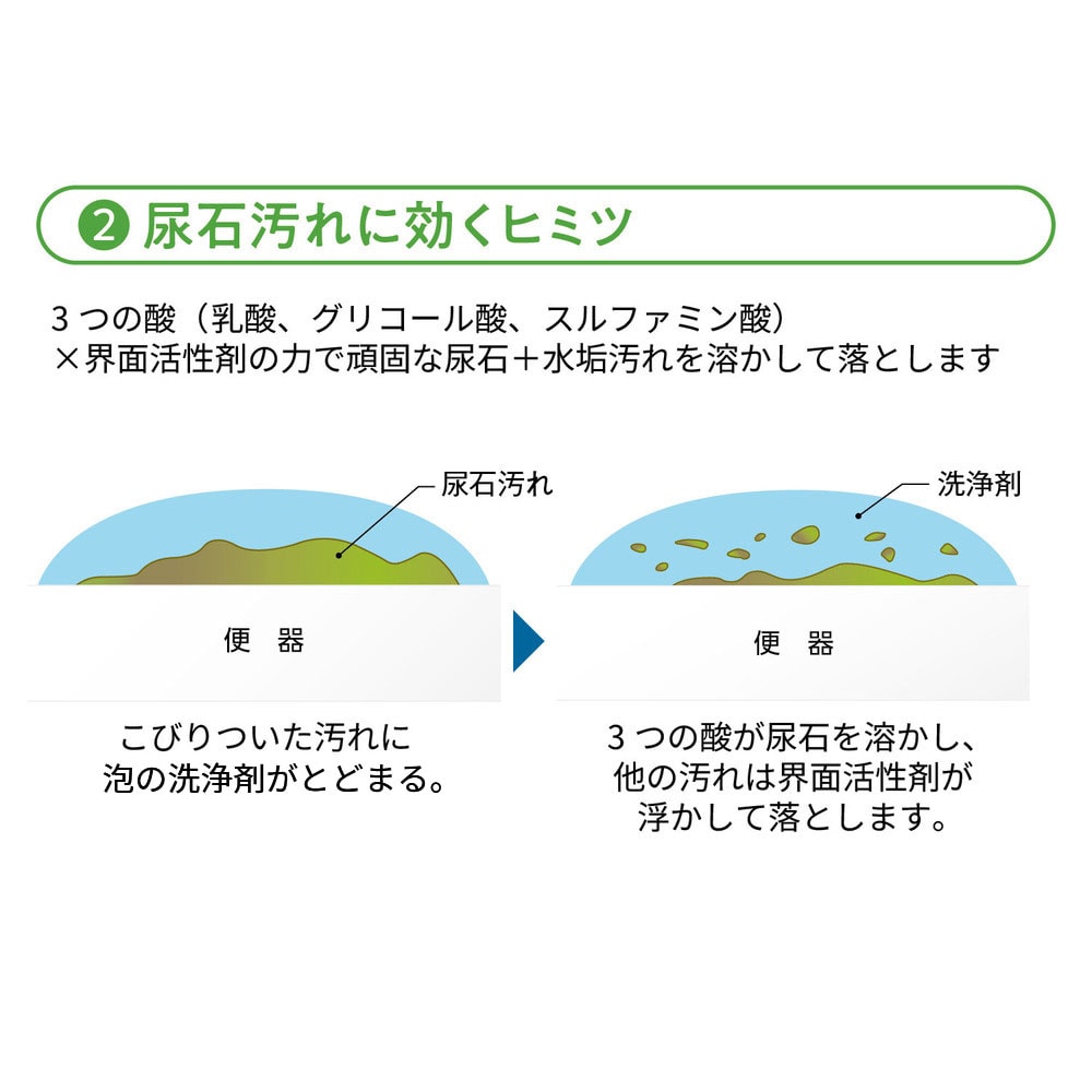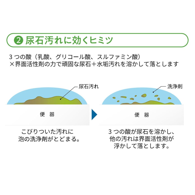●アルカリ性の尿石汚れを酸性洗剤が根こそぎ落とす!