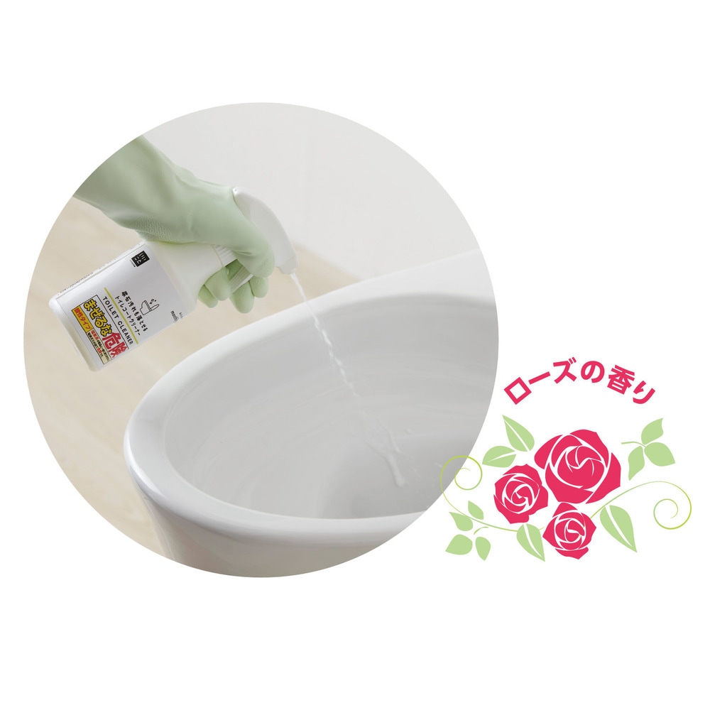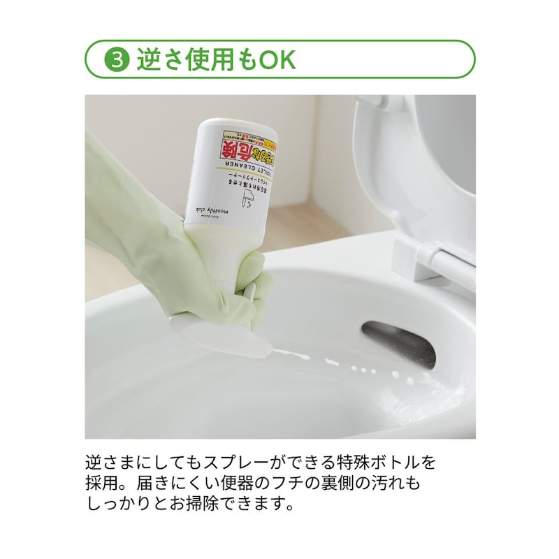 逆さまにしてもスプレーができる特殊ボトルで、届きにくい便器のフチの裏側の汚れもしっかり掃除可能。