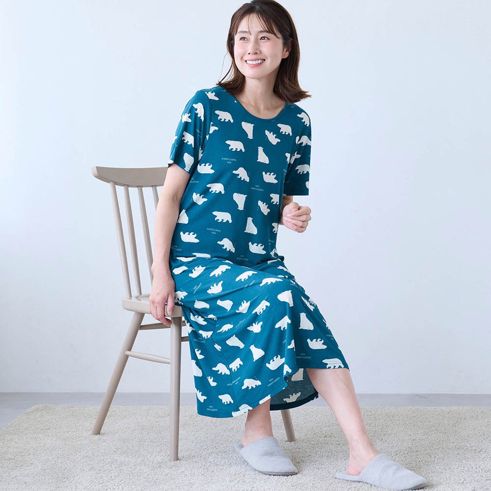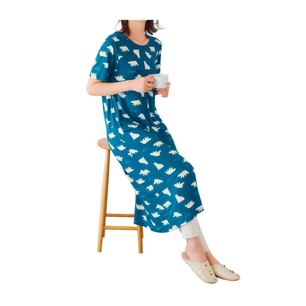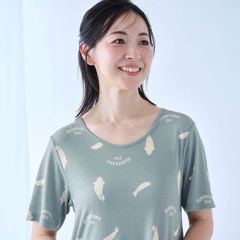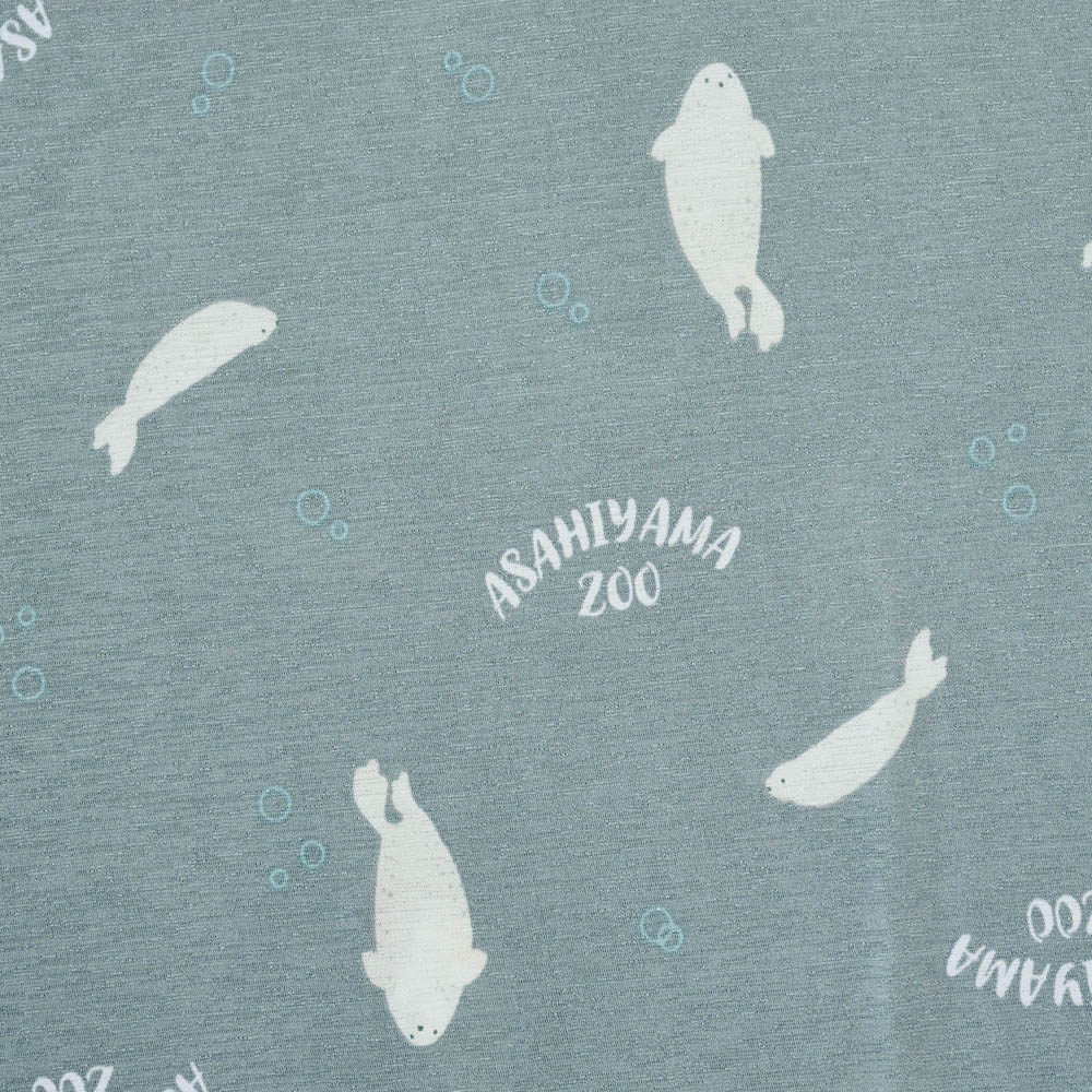 化繊ですがスラブ天竺なので「つるん」ではなく「ほんのりざらざら」(不快な感じではありません)の生地感。汗でベタつかないためのチョイスなんでしょうね。夏用の薄い生地は淡い色や白抜き模様が大きいと透けが心配で、もっと濃いグレーか青めグレーだったらアザラシの方も買ってました。シロクマ柄は白抜き柄がもうちょっと小さいか、はっきり子熊と判る大小混じりの方がもっと可愛かったかも。真冬に買ったので夏本番の汗かいた状態の着心地が判らないのでとりあえず☆4。蒸れないことを祈ります