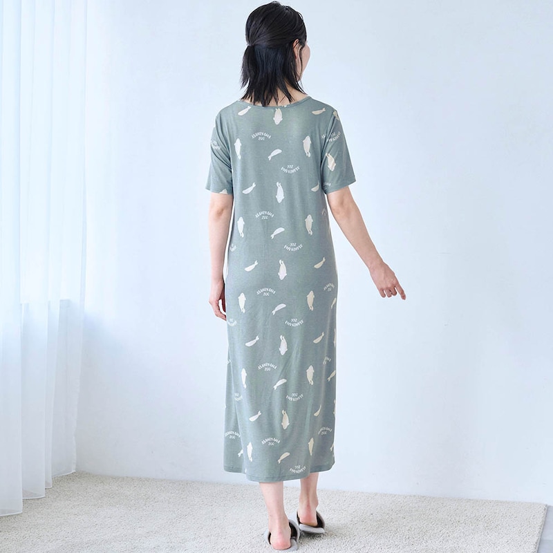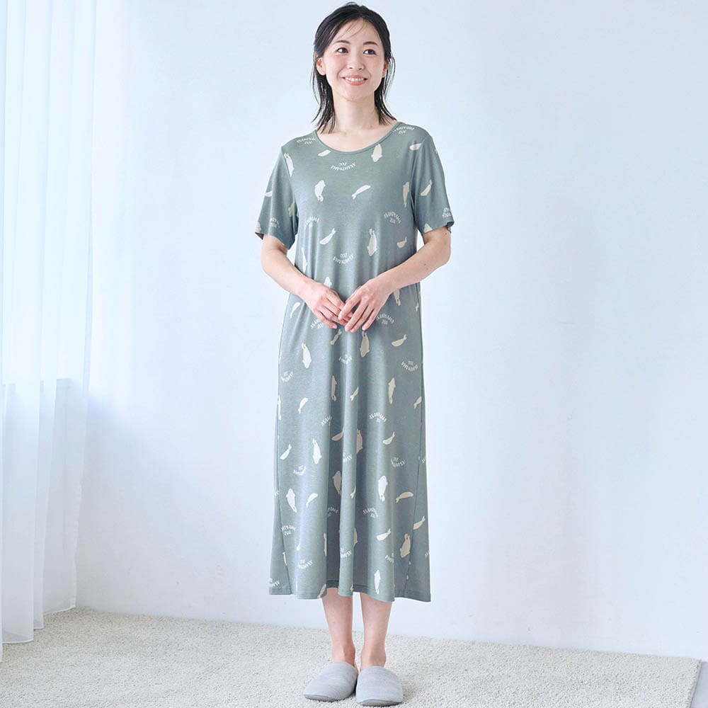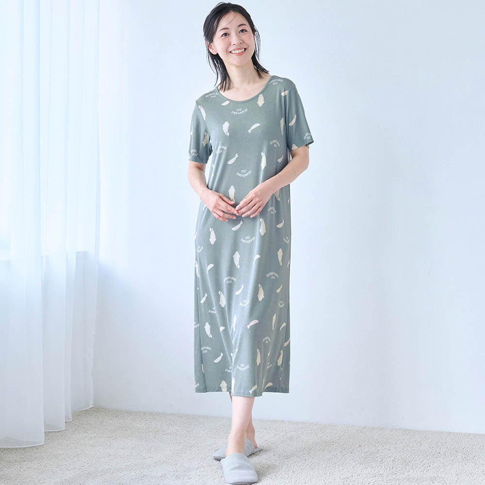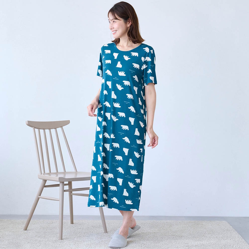 化繊ですがスラブ天竺なので「つるん」ではなく「ほんのりざらざら」(不快な感じではありません)の生地感。汗でベタつかないためのチョイスなんでしょうね。夏用の薄い生地は淡い色や白抜き模様が大きいと透けが心配で、もっと濃いグレーか青めグレーだったらアザラシの方も買ってました。シロクマ柄は白抜き柄がもうちょっと小さいか、はっきり子熊と判る大小混じりの方がもっと可愛かったかも。真冬に買ったので夏本番の汗かいた状態の着心地が判らないのでとりあえず☆4。蒸れないことを祈ります