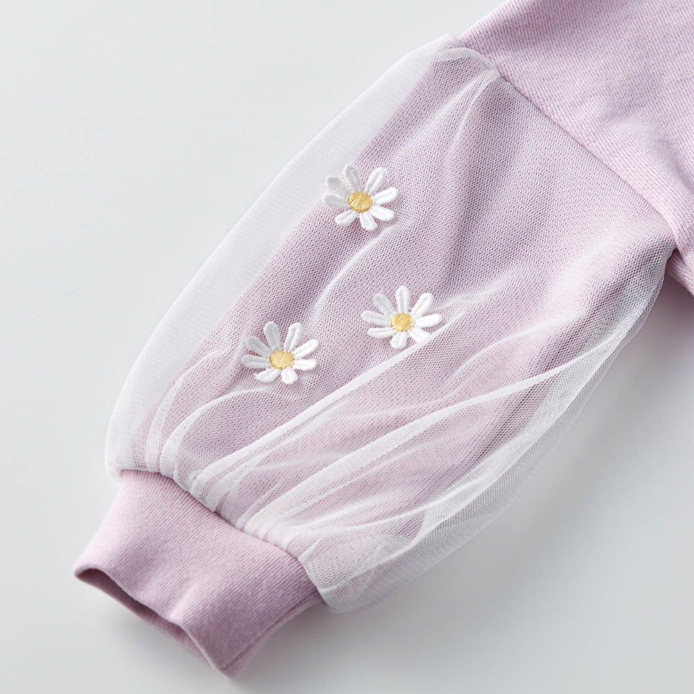 ・花刺繍ワッペンをあしらったチュール重ねの袖が、ふんわり可愛さをアップ