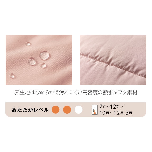 ●<織物>ポリエステル100%(表地:撥水タフタ、裏地:タフタ)、中わた:ポリエステル100%、襟裏:ポリエステル100%(フリース)