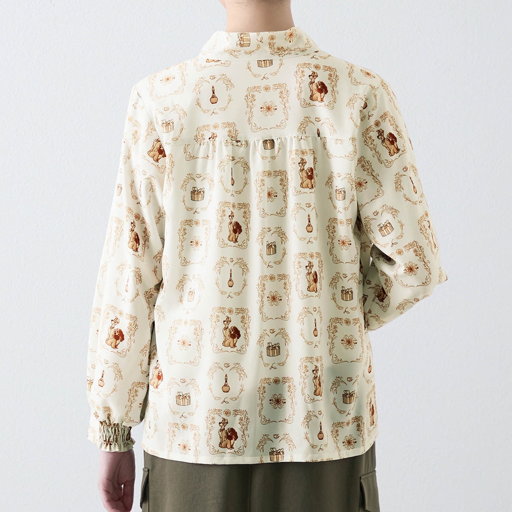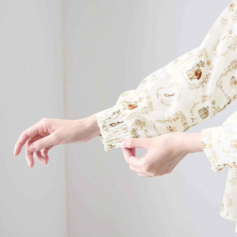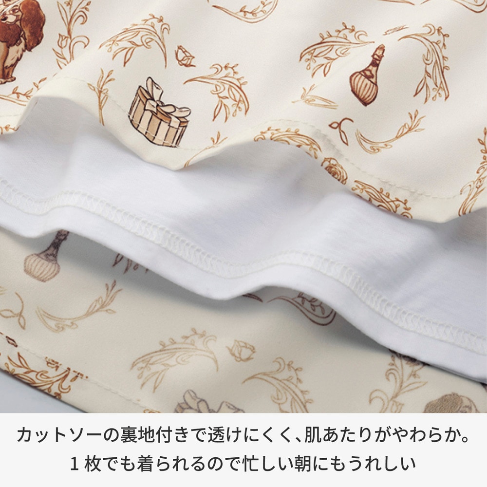 柄が凝っていてワンポイントのキャラクターが可愛いです。素材はイマイチでした。袖部分は伸びてきそうなゴムで、首元のボタンは白のシンプルなプラのボタンです。それから裏地が着膨れして見えるような気がします。