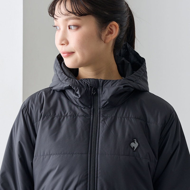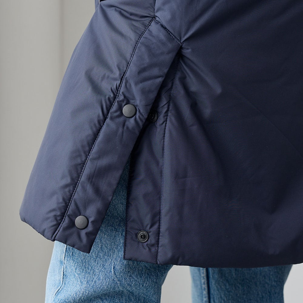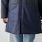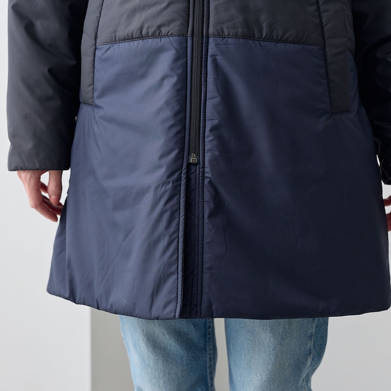 中綿入りで暖かく着用できる、配色切り替えロングコート