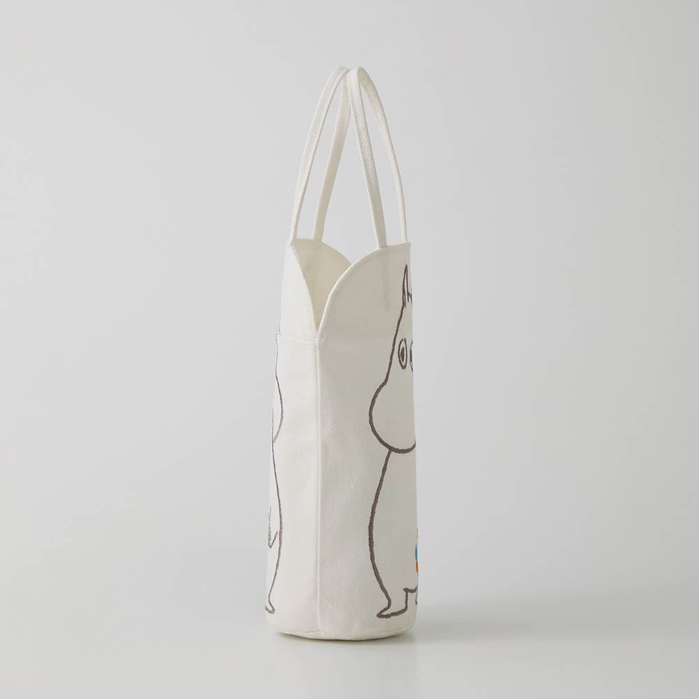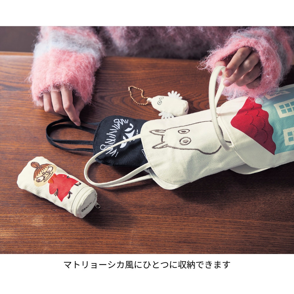 ムーミン谷の仲間が一度にお家へやってきて、とても可愛いです。写真のように、バケットを入れてお友達のお家にお邪魔したくて購入しました。意外にバッグの大きさが小さく、長いバケットは、はみ出しました。が、皆に、「可愛い、ムーミンママみたい」と言われ、大満足です。ムーミン谷の仲間が好きな方は、持っているだけで癒されると思います。ミイのポーチはキャンディ入れに。ニョロニョロのキーホルダーも可愛いです。
