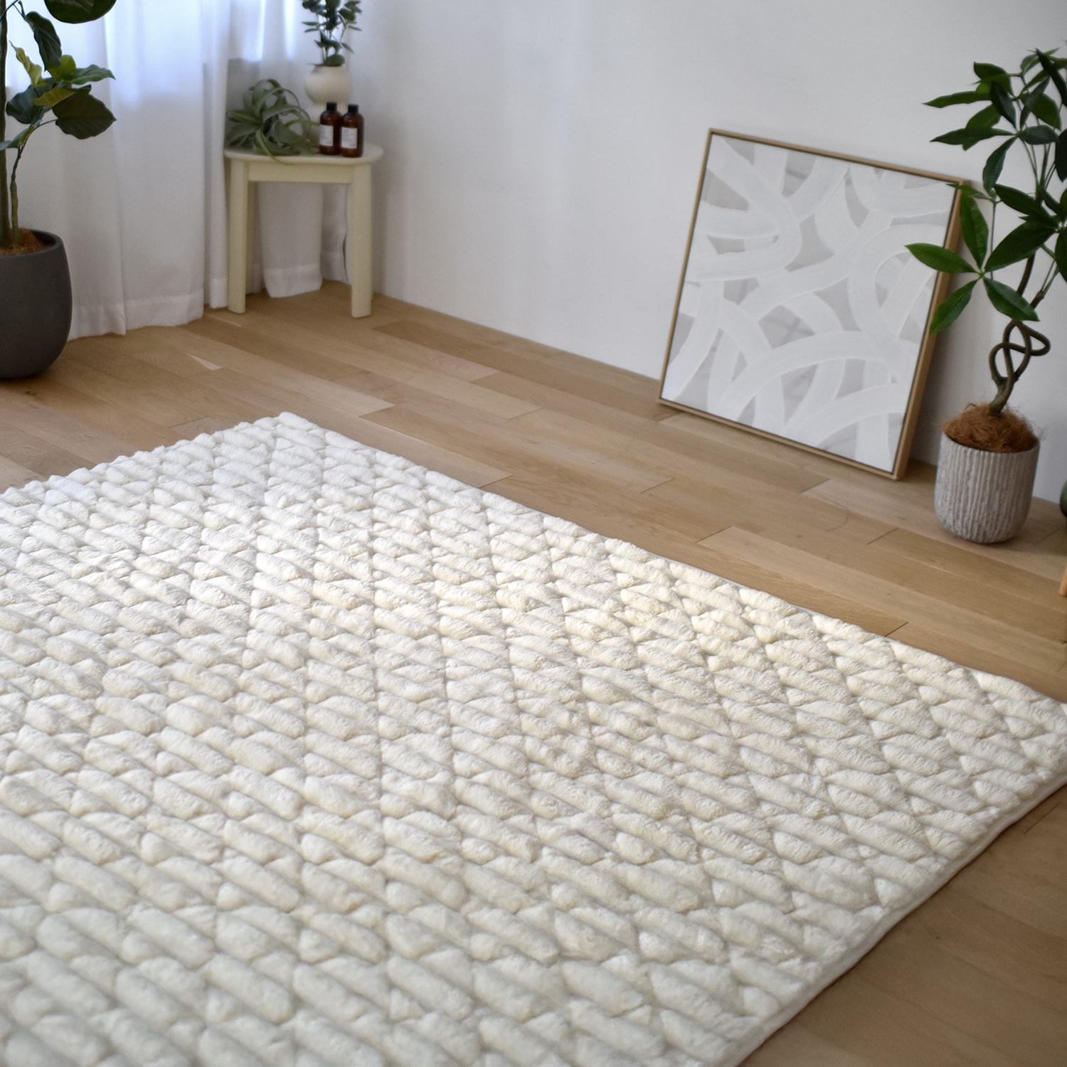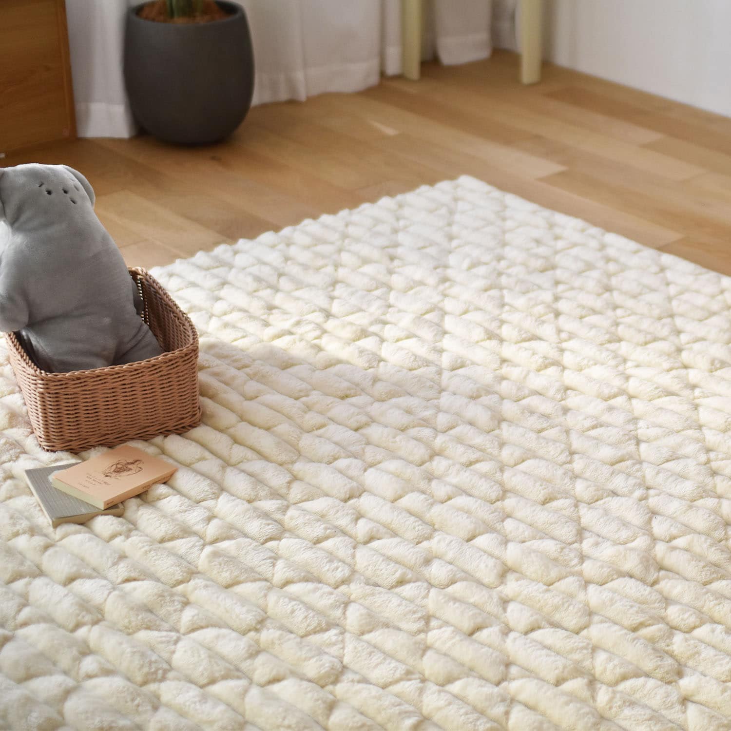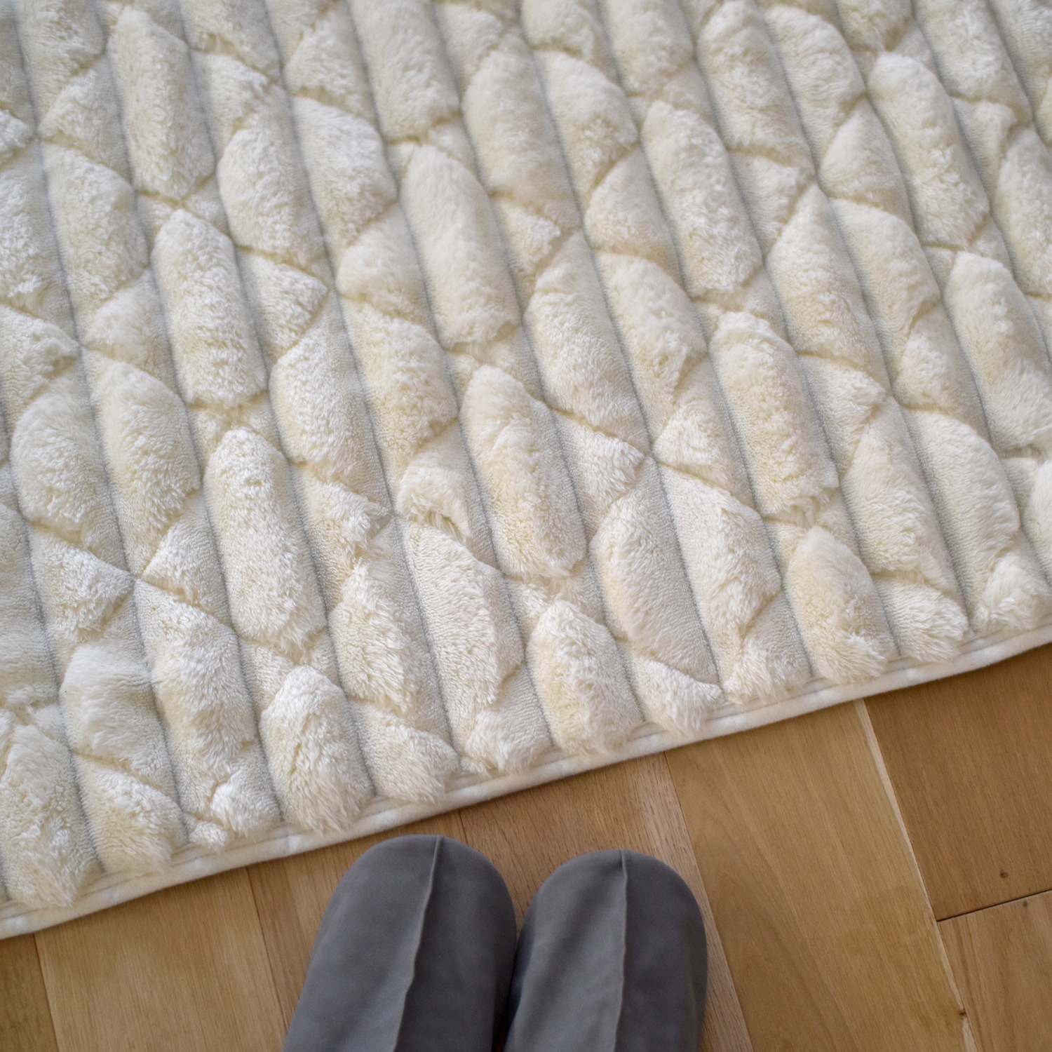 使っているカーペットの上に敷きました。ふわふわで、本当に気持ちが良いです。モカベージュを購入しましたが、色が上品で、落ち着いていて、それでいて暖かい感じで、見た目も満足しています。画像を見て、モコモコしていて掃除がしにくいのではないか、と心配していましたが、そんなこともなさそうです。