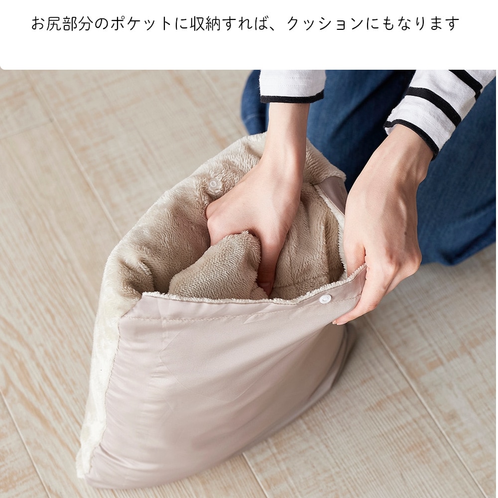 お尻部分にはクッションを入れるためのポケットつき。移動時は収納袋にもなります。
