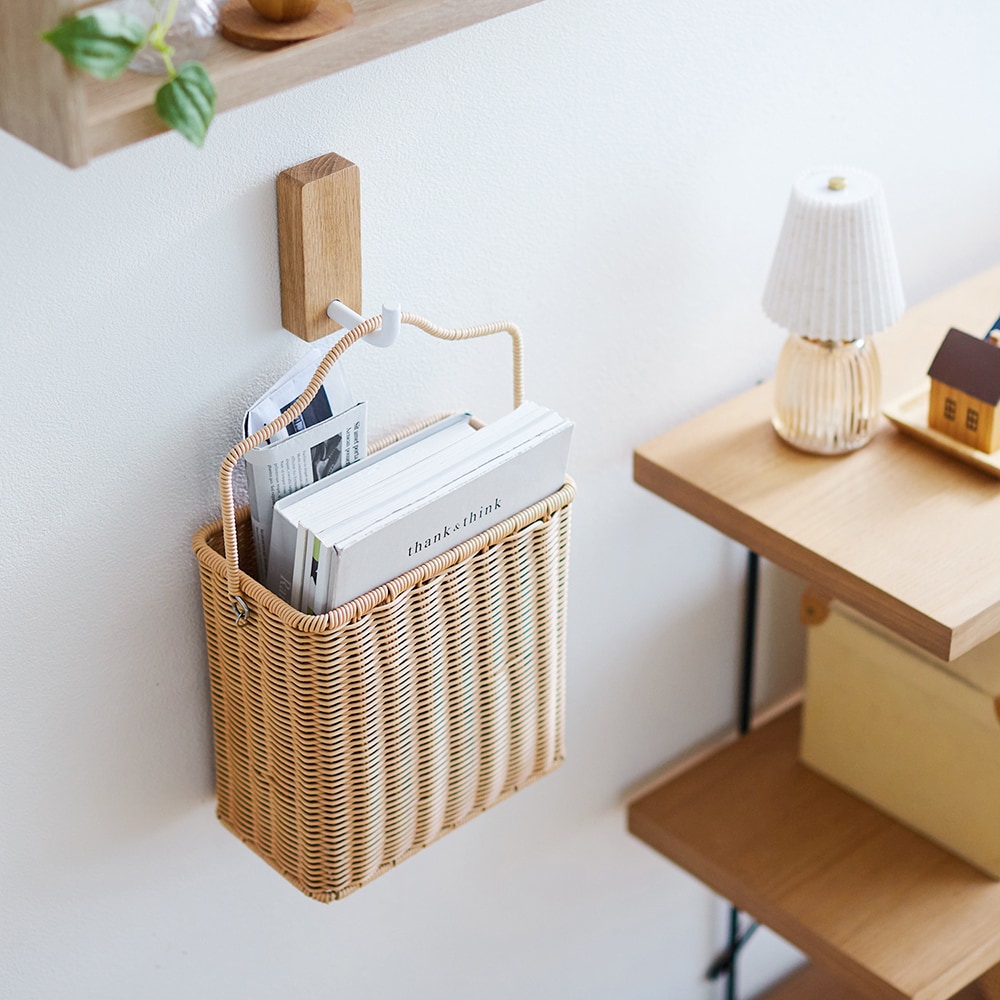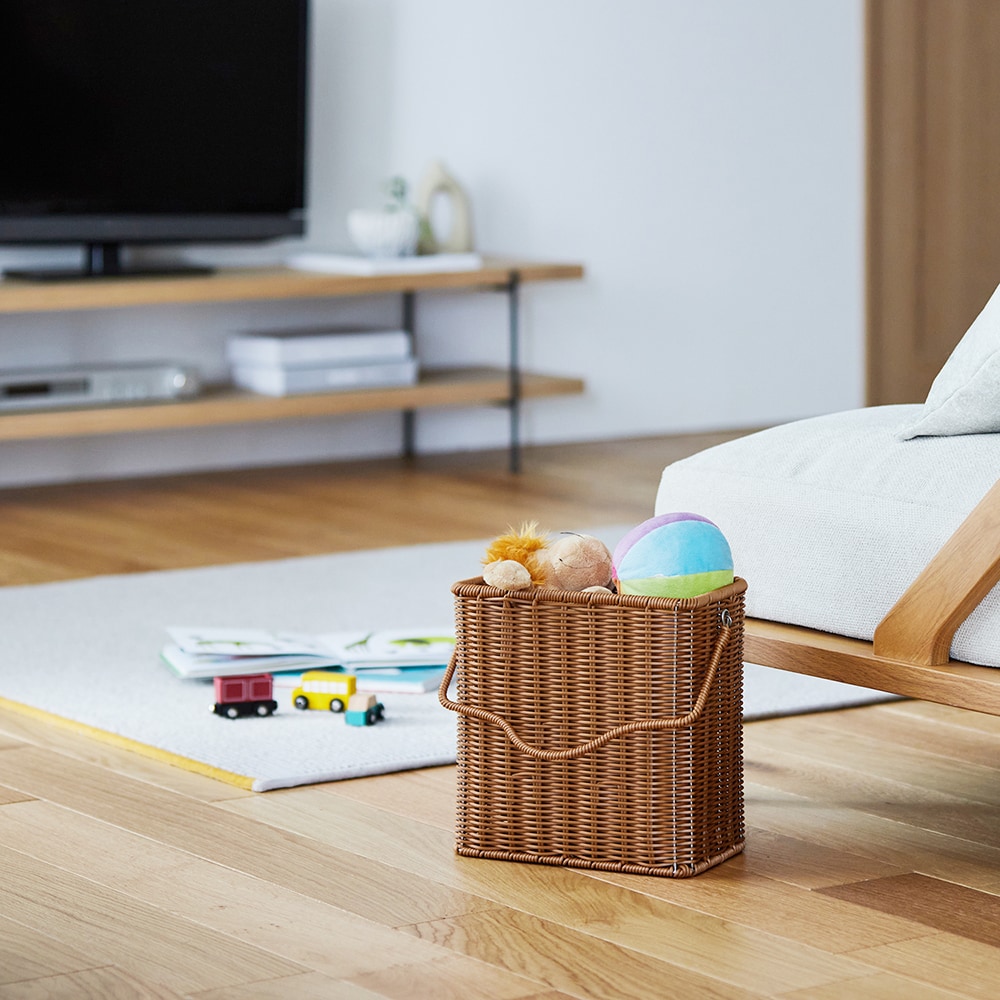 床やキッチンカウンターに積み重ねがちな書類、本類をサッとまとめて収納&浮かせられるバスケット。天然ラタンのような見た目で、水洗いも可能。掃除をラクにしたい方におすすめです。