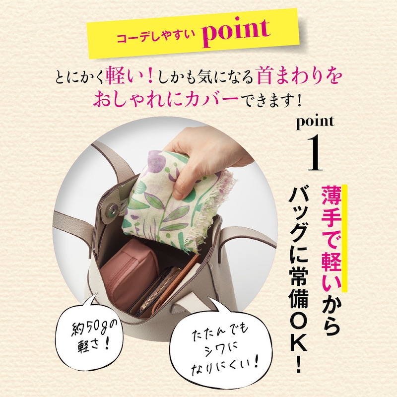 そんなときは、このストールをサッとひと巻き!とにかく軽く、しかも気になる首まわりをおしゃれにカバーできます。