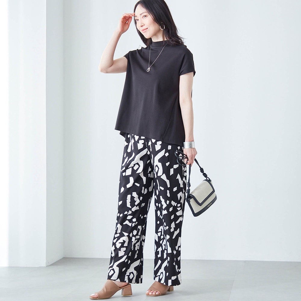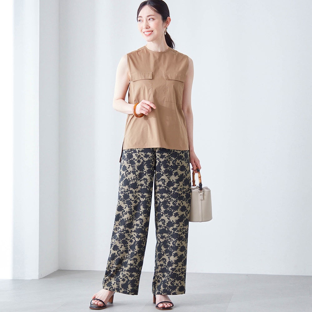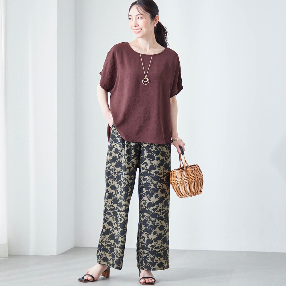 セールになっていたので買いました。画像で柄は実際どうかな?と思ったけど、意外と落ち着いて見え、合わせやすかったです。生地が気持ちよくサラサラです。歩くと揺れる感じも涼しげです。色味も秋っぽいので、30度超えの日には着ます。