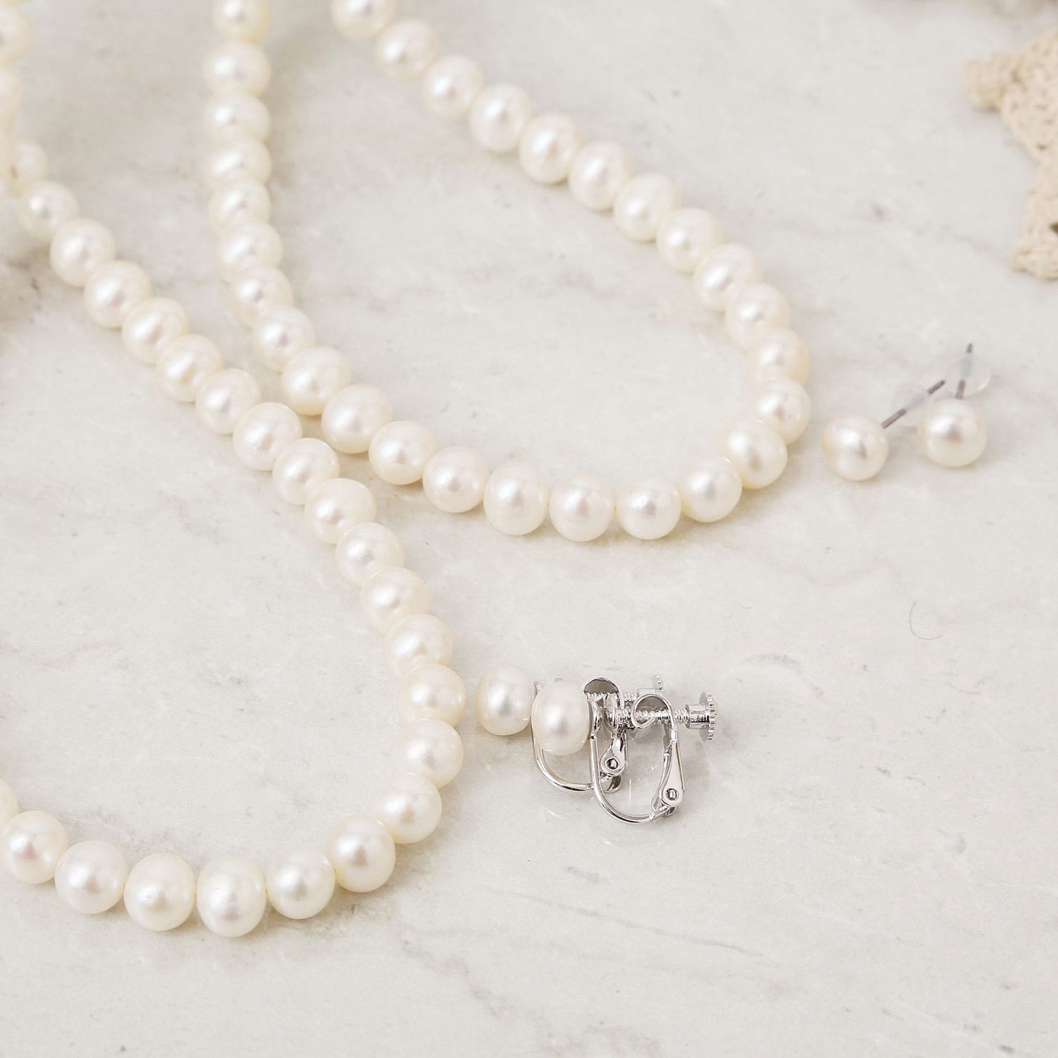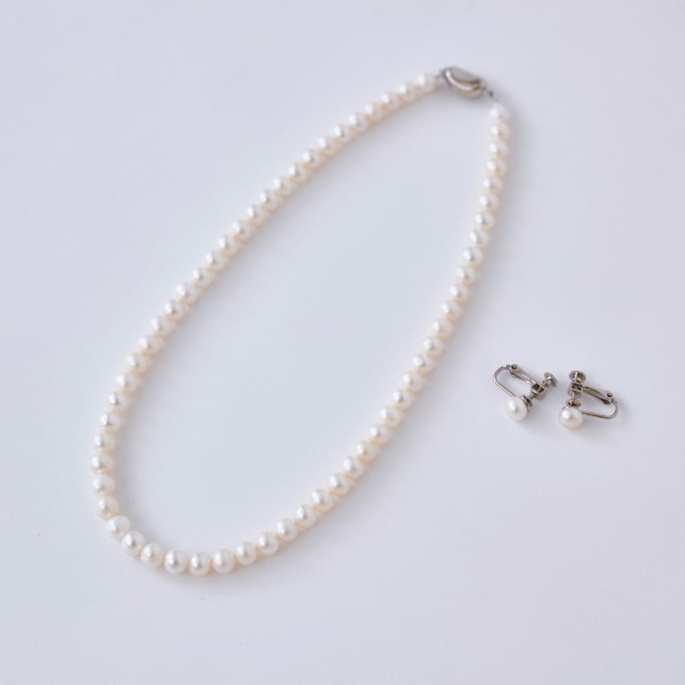 淡水パールのネックレスとイヤリング・ピアスのセット。
