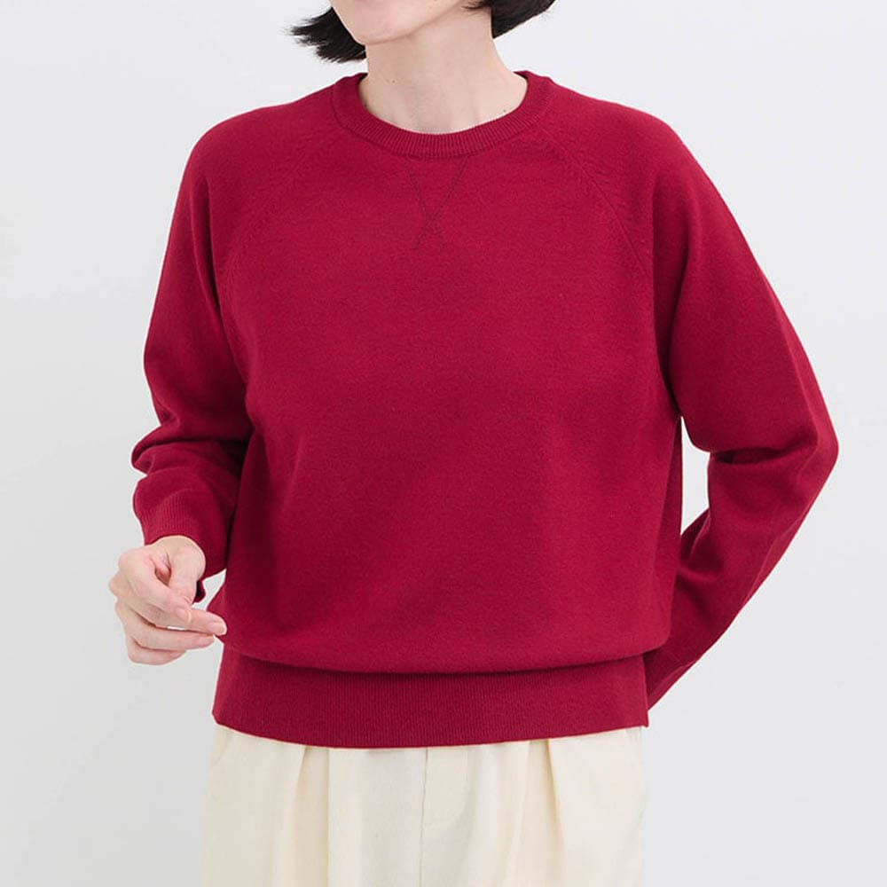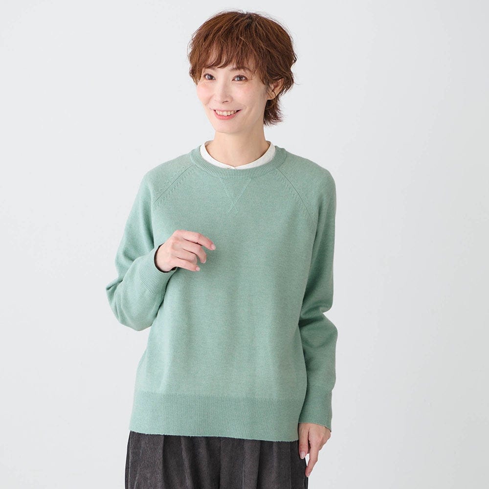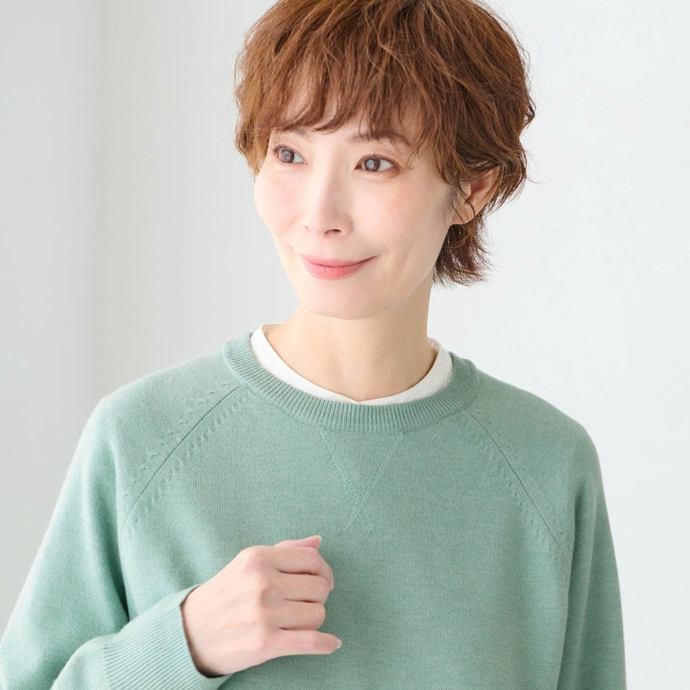 ニットは編み目が詰まっていて、ざらりとした感触です。柔らかさ重視というよりは、しっかりした生地感でカジュアル寄り。商品名の通り、スウェット感覚で気軽に着られる印象です。