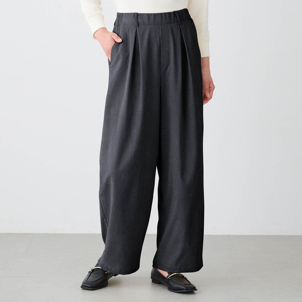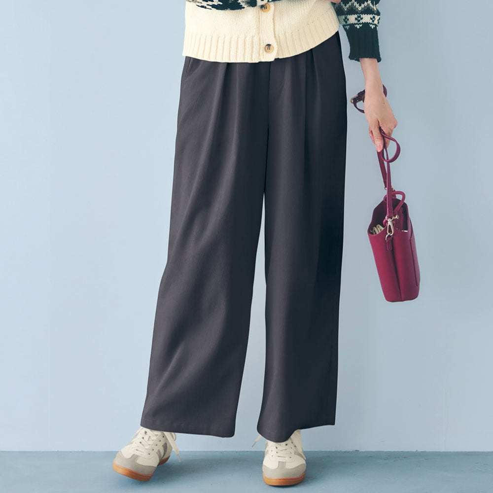 ・タック入りのワイドシルエットで脚のラインを拾いにくい