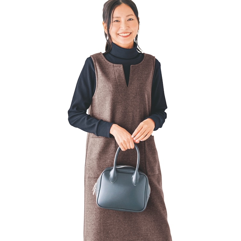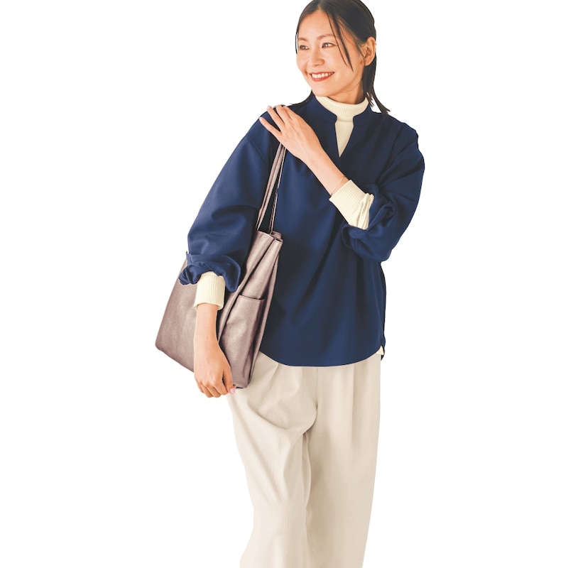手持ちの物とも色々合わせてみましたが、襟回りがゆったりめ・高めなので、ボトルネックの下に着ても襟を出すことができます。悪戯心で後ろ前に着てみたら、スリットがチビ襟のようになって可愛かったです。白い襟があるだけで、少々派手に見えるかと敬遠気味になっていた物がまた着られるようになりました。