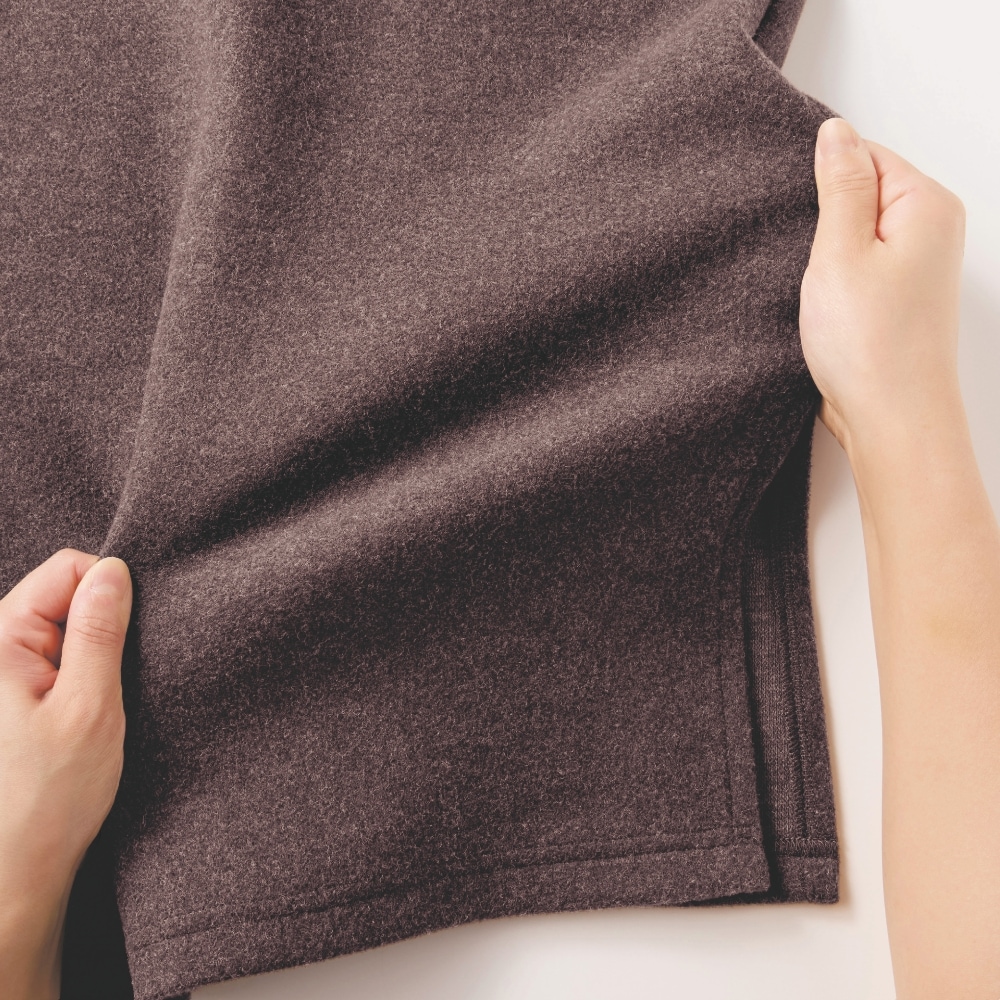 思っていたより厚地でしっかりしてます。暖かいし、体型が表に出なくて、良いです。迷ったけれど注文して良かった。色はカタログで見るより濃いめです。