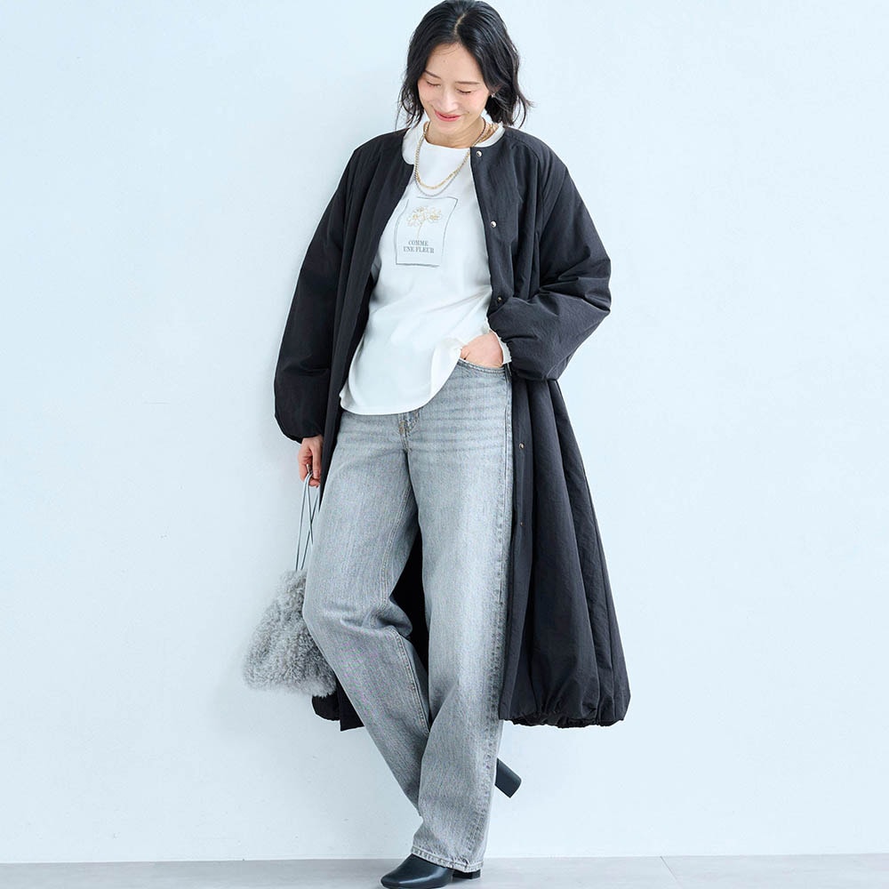 159cmぽっちゃり型でサイズをどうするかかなり迷いましたが、M~Lでゆったり着れてます。ナイロン素材でノーカラーなのですっきりおしゃれに着れるかな?と思って購入。暖かさはそこまで求めていなかったけどかなり防寒できています!この冬重宝しそうです☆