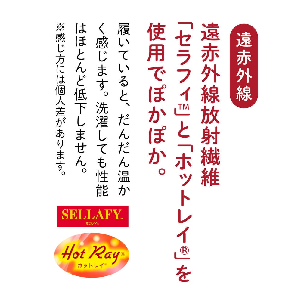 遠赤外線放射繊維「セラフィ(TM)」と「ホットレイ(R)」を使用し、履いているとだんだん温かく感じます。※1