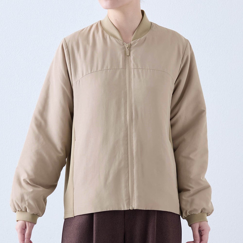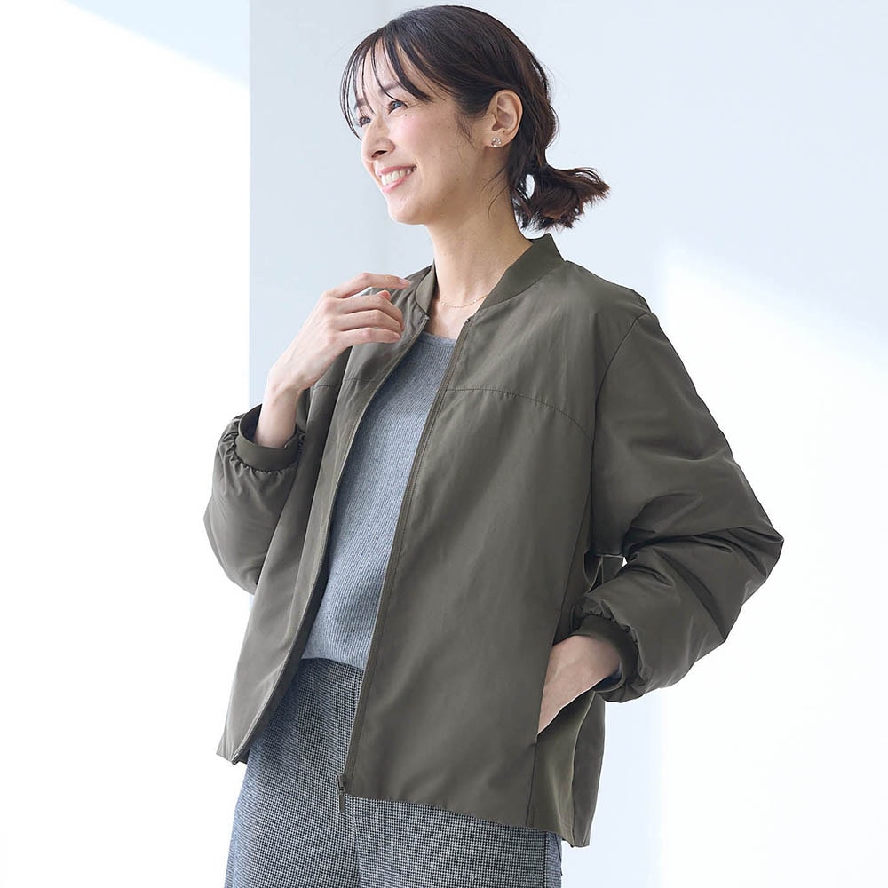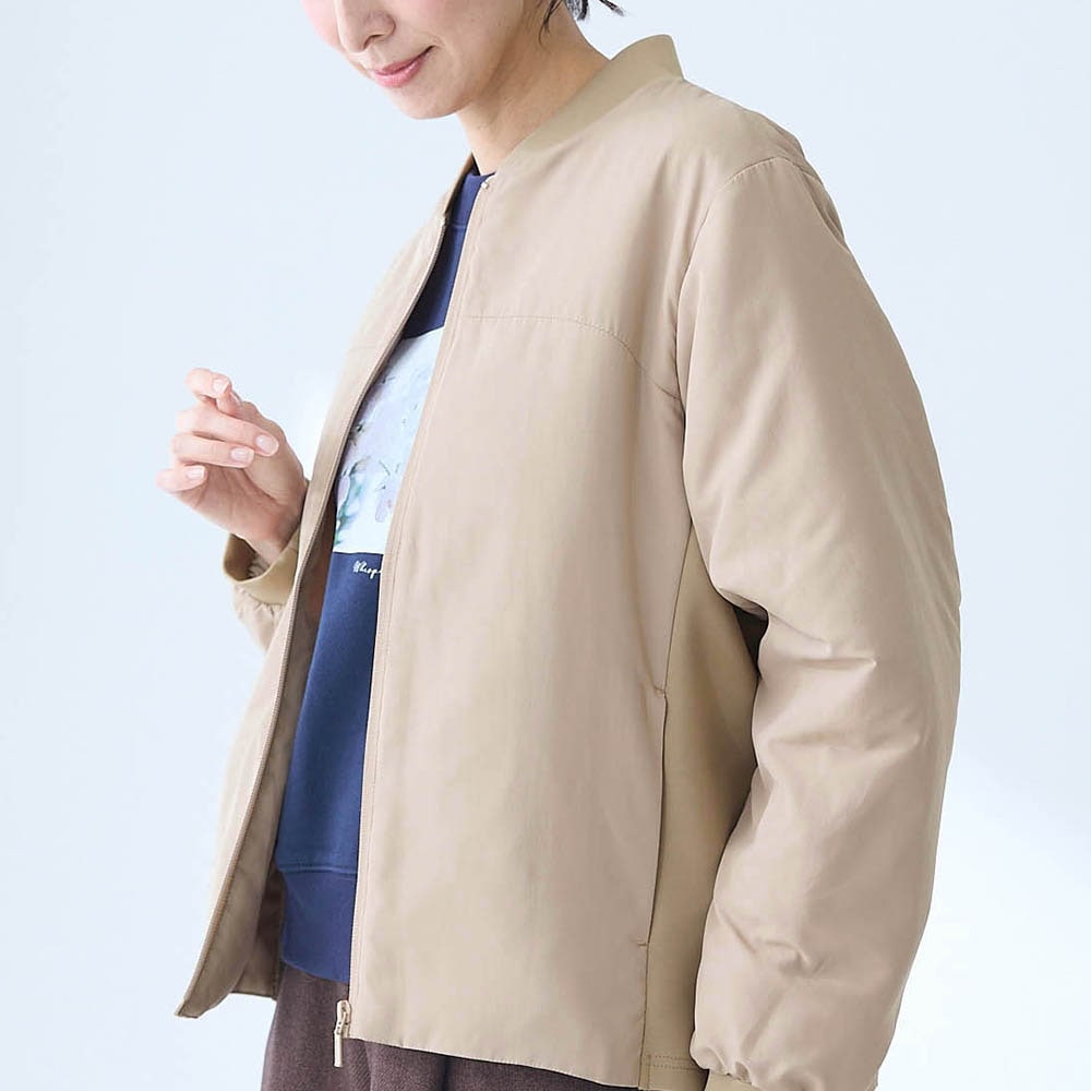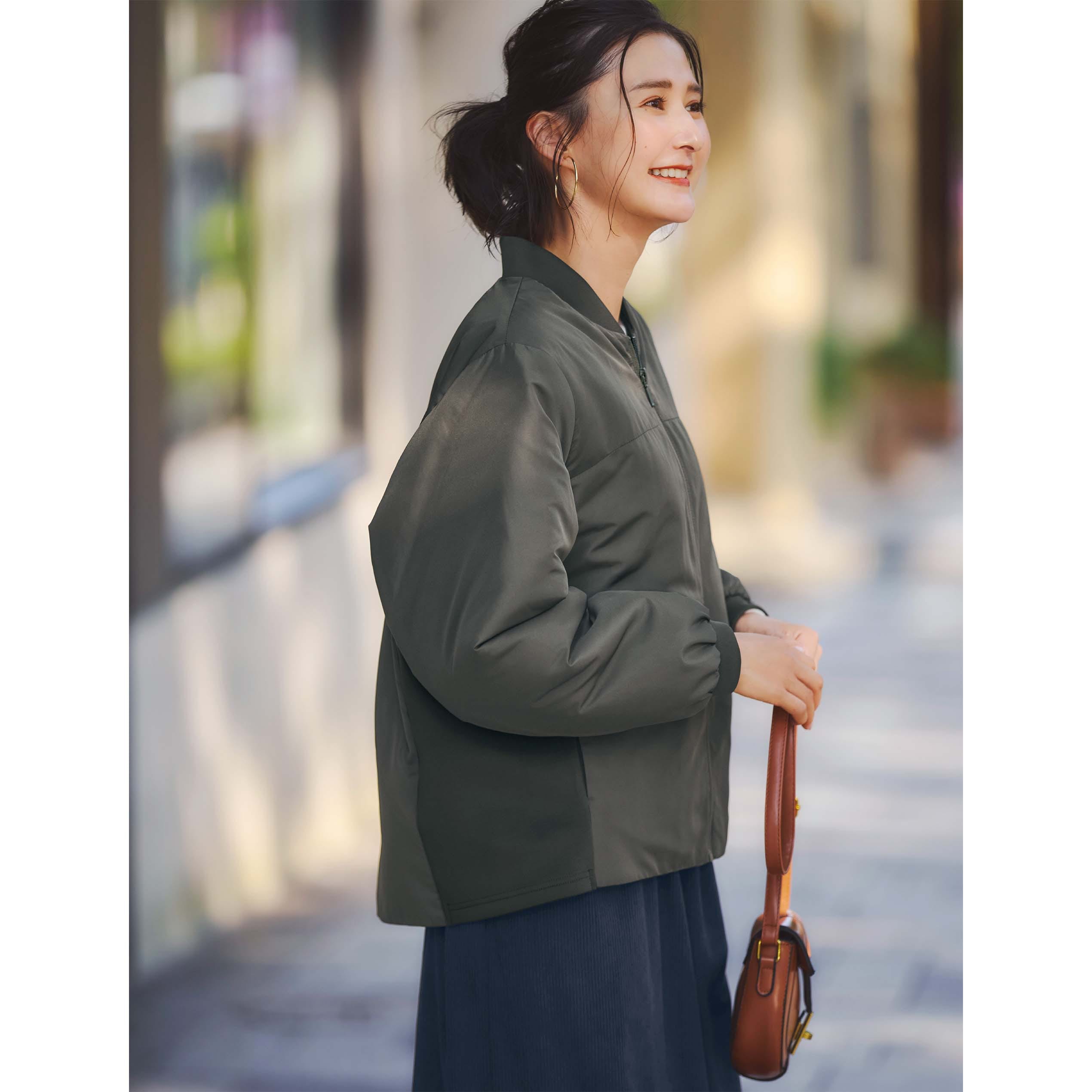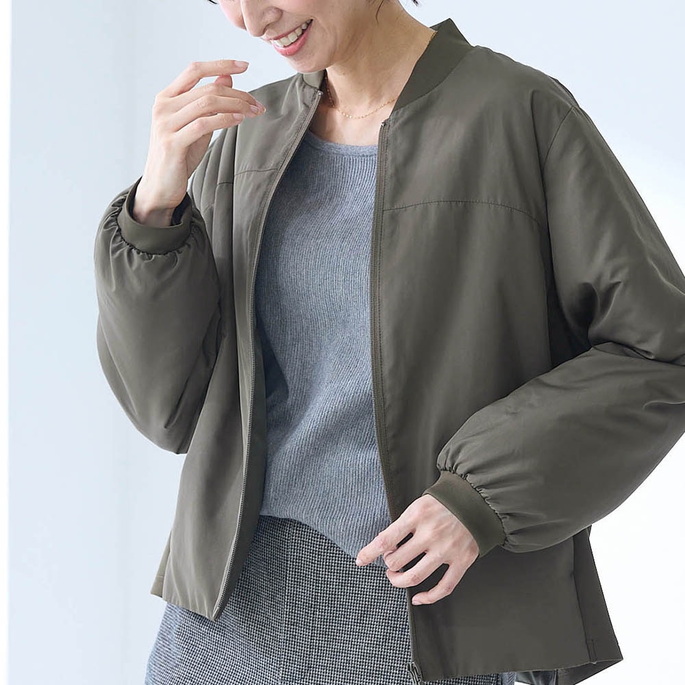 商説の通り、着た感じは軽いです。何よりサイズ感がとても気に入りました。ファスナーを閉めても、サイドのストレッチ素材のお陰できつくないです。保温と撥水については、そういう天気の時に着てないのでわかりません。