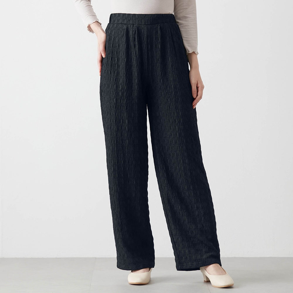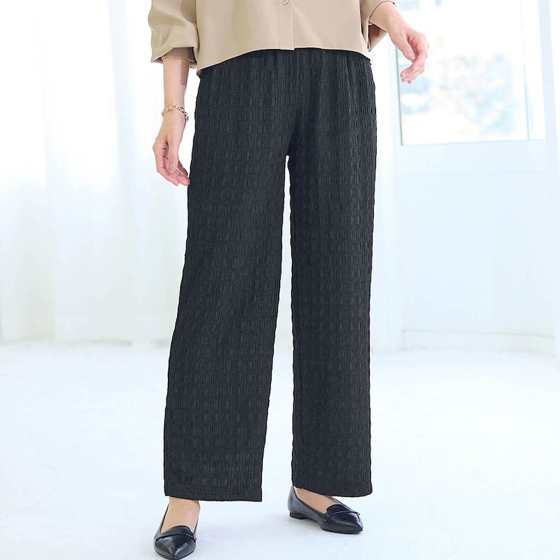 洗ってもシワにならないし、パンツには裏地がついています。着すぎて少し毛玉ができてきました。