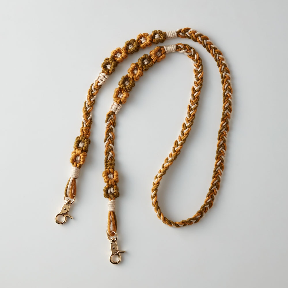 紐を結ぶだけのマクラメの技法を使った、カラフルで華やかなデザイン。