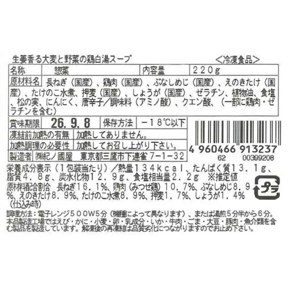 ・生姜香る大麦野菜の鶏白湯スープ:国産鶏肉のコク深い旨味が溶け込んだ、大麦、野菜を一層おいしく引き立てる生姜香る鶏白湯