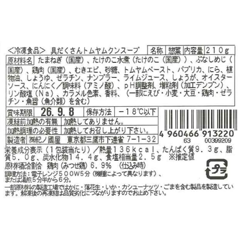 ●生姜香る大麦野菜の鶏白湯スープ(220g)、1/3日分野菜のミネストローネ(220g)、具だくさんトムヤムクン(210g)、じっくり炒めたオニオンスープ(220g)×各1 計4袋