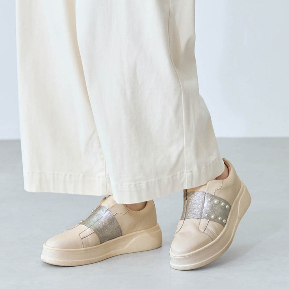 スニーカータイプですがしっかりとヒール(底)がありデザインが素敵なのでカジュアルにもまたお出かけで少々ドレスアップしても違和感なく気に入っています。すっぽりと足を包んでくれて軽くて歩きやすいのですが、脱ぎ履きに少し手間取るのと踵部分が結構深めなせいか靴づれが起こります。本革なのでこれから履いているうちに馴染んで行くであろうことを期待しています。